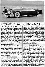 Virgil Exner designed the parade phaeton as part of his early design work at Chrysler. Three were built for the purpose of carrying dignitaries and other "high-profile" folks. (Great public relations for Chrysler's image) They were built on stretched '52 Imperial chassis' with all new custom sheet metal framed by the current grille and taillight treatment. Two of the vehicles were given to New York and Los Angeles. The third was originally planned to be given to the White House. However, since the White House isnot permitted to receive gifts of this nature, Chrysler titled the car with Detroit and shipped the car around at its descretion. The original color schemes were black with grey interior for New York, cream with red interior for L.A. and green with tan interior for "Detroit."