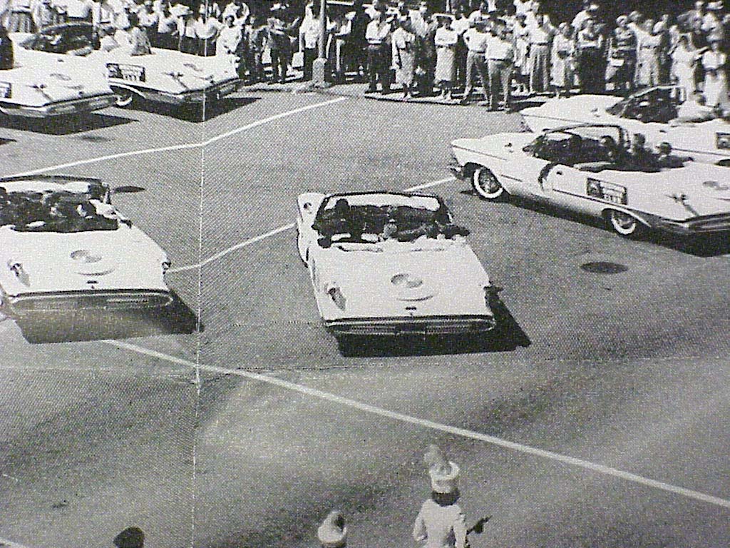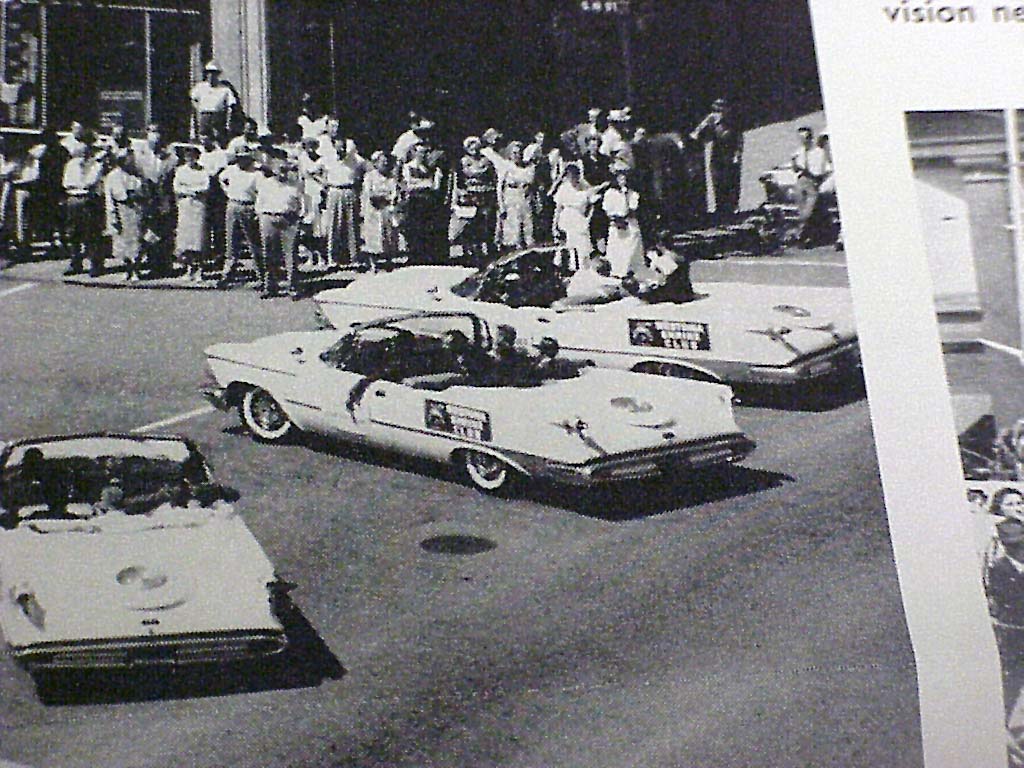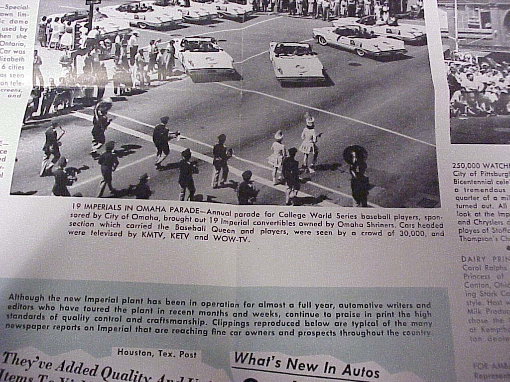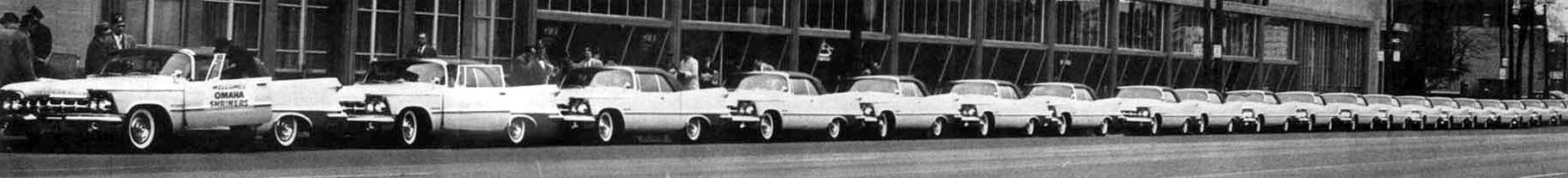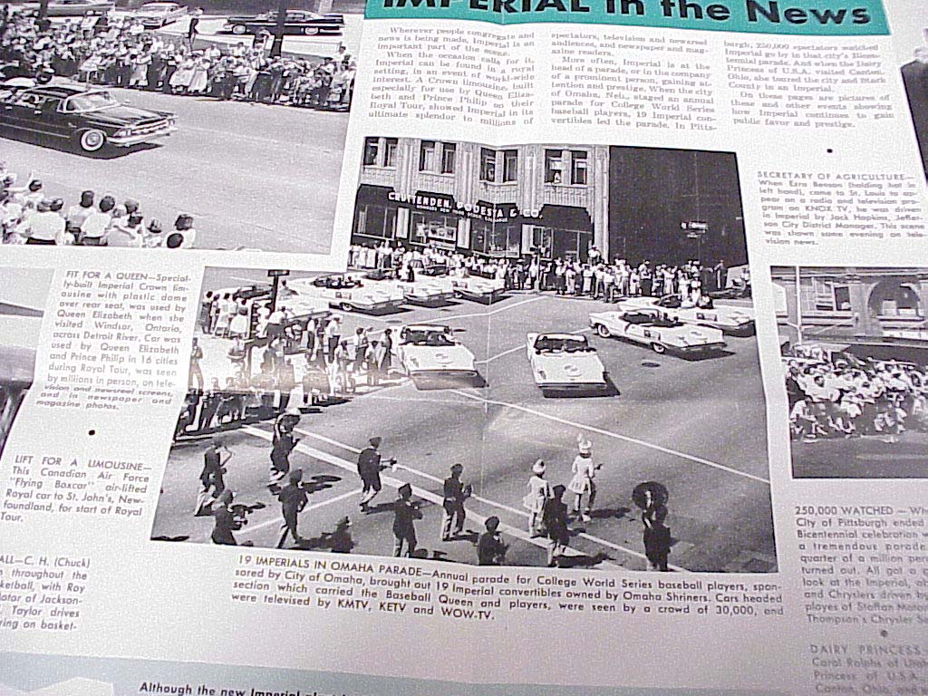 This imposing lineup of 21 Imperial convertibles greeted 21 prominent Omaha, Nebraska, businessmen when they arrived at the Chrysler and Imperial Division to pick up their cars. Besides being the biggest retail driveaway in Imperial's history, the cars were identical - white exterior with blue leather upholstery. Extras include air conditioning, Auto-Pilot and Solex glass. The owners, all members of the Omaha Shriner's organization, will use the cars in parades and other fund-raising activities for the benefit of crippled children.Here are some shots of an article in the September? 1959 'Imperial Times" Dealer newsletter showing the Imps of Omaha in the 1959 College World Series Parade through Downtown Omaha Nebraska