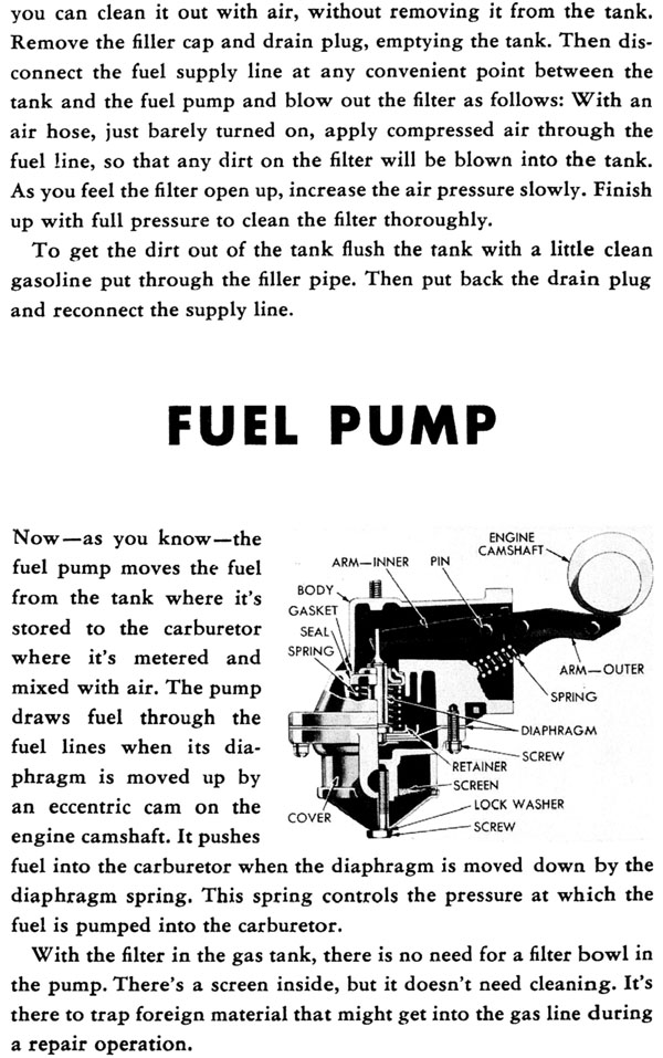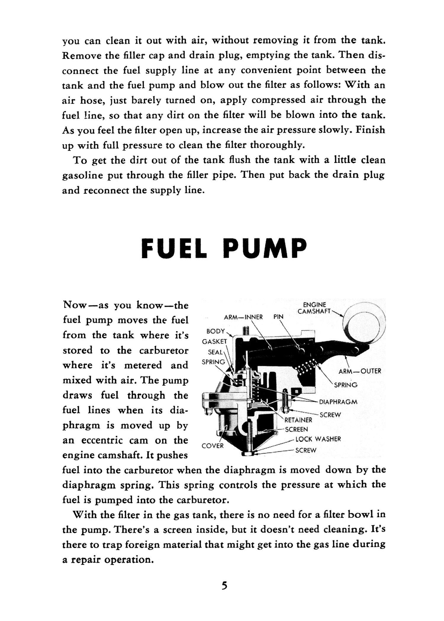 Front Cover Page 2 - Introduction To The Booklet Page 3 - Looking At The Whole Fuel System Page 4 - Fuel Tank and Filter Page 5 - Fuel Pump Page 6 - The Air Cleaner Page 7 - Gasoline + Air = Power Page 8 - Your Engine Is Really An Air Pump Page 9 - More About Carburetor Fundamentals Page 10 - What The Float System Does Page 11 - Other Causes Of High Fuel Levels Page 12 - The Main Metering System Page 13 - What The Throttle Valve Does Page 14 - Main Air Bleed Page 15 - Leaner Than Jet Standards Page 16 - Main Metering Jets Troubleshooting Page 17 - Ball & Ball Carburetors Set-Up Page 18 - Stromberg Carburetor Set-Up Page 19 - More On The Stromberg Carburetor Page 20 - Idle & Low Speed System Page 21 - More On The Low Speed System Page 22 - How To Adjust Engine Idle Page 23 - How To Diagnose Trouble In The Idle System Page 24 - Where The Accelerator System Takes Over Page 25 - Accelerator Pump Troubleshooting Page 26 - Adjusting The Pump Stroke Page 27 - The Choke System Page 28 - Keeping It Clean Page 29 - More On Cleaning The Carburetor Page 30 - Dash-Pot Page 31 - The Kick Down Switch Back Cover & Booklet Questionnaire