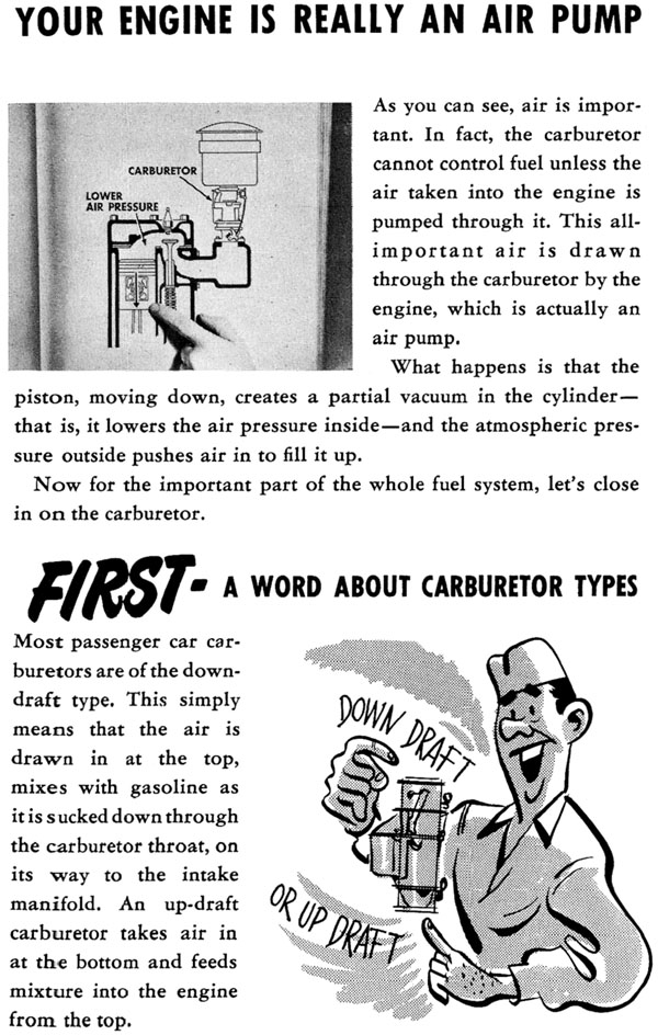 Front Cover Page 2 - Introduction To The Booklet Page 3 - Looking At The Whole Fuel System Page 4 - Fuel Tank and Filter Page 5 - Fuel Pump Page 6 - The Air Cleaner Page 7 - Gasoline + Air = Power Page 8 - Your Engine Is Really An Air Pump Page 9 - More About Carburetor Fundamentals Page 10 - What The Float System Does Page 11 - Other Causes Of High Fuel Levels Page 12 - The Main Metering System Page 13 - What The Throttle Valve Does Page 14 - Main Air Bleed Page 15 - Leaner Than Jet Standards Page 16 - Main Metering Jets Troubleshooting Page 17 - Ball & Ball Carburetors Set-Up Page 18 - Stromberg Carburetor Set-Up Page 19 - More On The Stromberg Carburetor Page 20 - Idle & Low Speed System Page 21 - More On The Low Speed System Page 22 - How To Adjust Engine Idle Page 23 - How To Diagnose Trouble In The Idle System Page 24 - Where The Accelerator System Takes Over Page 25 - Accelerator Pump Troubleshooting Page 26 - Adjusting The Pump Stroke Page 27 - The Choke System Page 28 - Keeping It Clean Page 29 - More On Cleaning The Carburetor Page 30 - Dash-Pot Page 31 - The Kick Down Switch Back Cover & Booklet Questionnaire