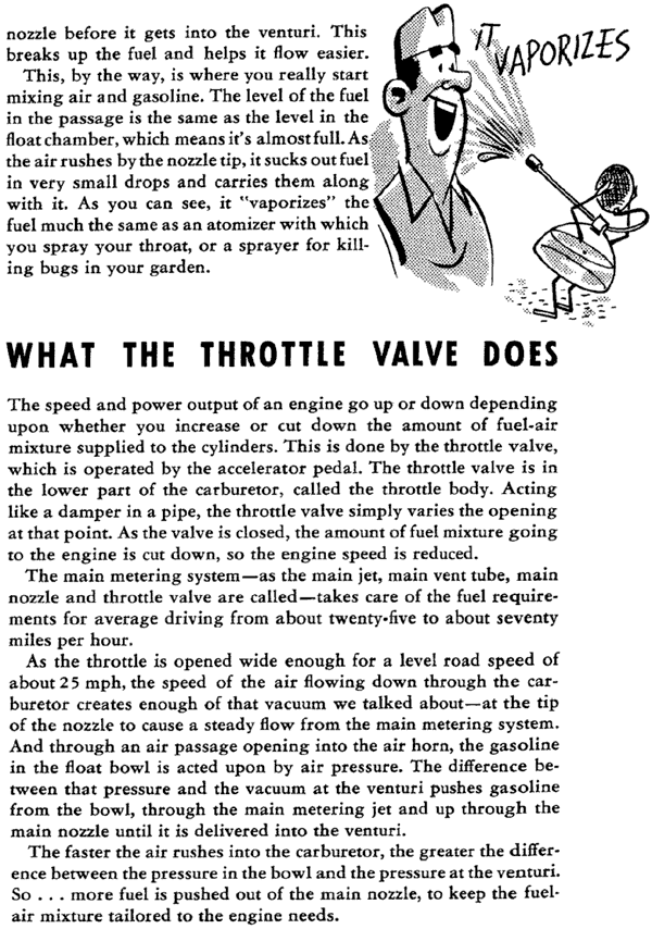 Front Cover Page 2 - Introduction To The Booklet Page 3 - Looking At The Whole Fuel System Page 4 - Fuel Tank and Filter Page 5 - Fuel Pump Page 6 - The Air Cleaner Page 7 - Gasoline + Air = Power Page 8 - Your Engine Is Really An Air Pump Page 9 - More About Carburetor Fundamentals Page 10 - What The Float System Does Page 11 - Other Causes Of High Fuel Levels Page 12 - The Main Metering System Page 13 - What The Throttle Valve Does Page 14 - Main Air Bleed Page 15 - Leaner Than Jet Standards Page 16 - Main Metering Jets Troubleshooting Page 17 - Ball & Ball Carburetors Set-Up Page 18 - Stromberg Carburetor Set-Up Page 19 - More On The Stromberg Carburetor Page 20 - Idle & Low Speed System Page 21 - More On The Low Speed System Page 22 - How To Adjust Engine Idle Page 23 - How To Diagnose Trouble In The Idle System Page 24 - Where The Accelerator System Takes Over Page 25 - Accelerator Pump Troubleshooting Page 26 - Adjusting The Pump Stroke Page 27 - The Choke System Page 28 - Keeping It Clean Page 29 - More On Cleaning The Carburetor Page 30 - Dash-Pot Page 31 - The Kick Down Switch Back Cover & Booklet Questionnaire