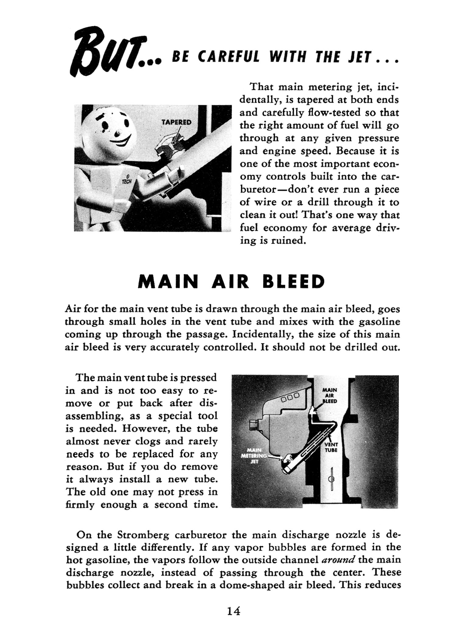 Front Cover Page 2 - Introduction To The Booklet Page 3 - Looking At The Whole Fuel System Page 4 - Fuel Tank and Filter Page 5 - Fuel Pump Page 6 - The Air Cleaner Page 7 - Gasoline + Air = Power Page 8 - Your Engine Is Really An Air Pump Page 9 - More About Carburetor Fundamentals Page 10 - What The Float System Does Page 11 - Other Causes Of High Fuel Levels Page 12 - The Main Metering System Page 13 - What The Throttle Valve Does Page 14 - Main Air Bleed Page 15 - Leaner Than Jet Standards Page 16 - Main Metering Jets Troubleshooting Page 17 - Ball & Ball Carburetors Set-Up Page 18 - Stromberg Carburetor Set-Up Page 19 - More On The Stromberg Carburetor Page 20 - Idle & Low Speed System Page 21 - More On The Low Speed System Page 22 - How To Adjust Engine Idle Page 23 - How To Diagnose Trouble In The Idle System Page 24 - Where The Accelerator System Takes Over Page 25 - Accelerator Pump Troubleshooting Page 26 - Adjusting The Pump Stroke Page 27 - The Choke System Page 28 - Keeping It Clean Page 29 - More On Cleaning The Carburetor Page 30 - Dash-Pot Page 31 - The Kick Down Switch Back Cover & Booklet Questionnaire