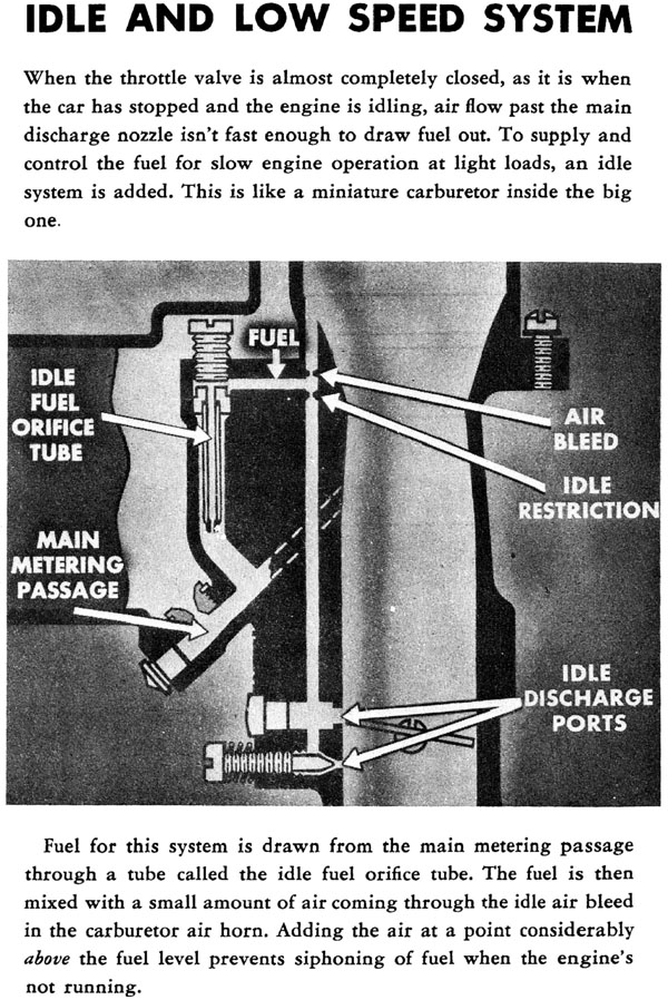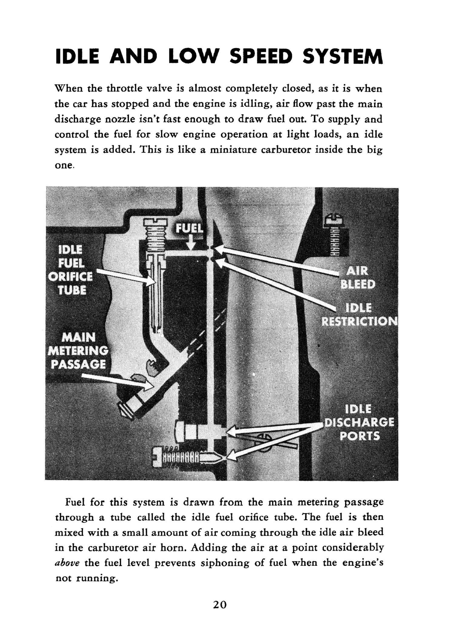 Front Cover Page 2 - Introduction To The Booklet Page 3 - Looking At The Whole Fuel System Page 4 - Fuel Tank and Filter Page 5 - Fuel Pump Page 6 - The Air Cleaner Page 7 - Gasoline + Air = Power Page 8 - Your Engine Is Really An Air Pump Page 9 - More About Carburetor Fundamentals Page 10 - What The Float System Does Page 11 - Other Causes Of High Fuel Levels Page 12 - The Main Metering System Page 13 - What The Throttle Valve Does Page 14 - Main Air Bleed Page 15 - Leaner Than Jet Standards Page 16 - Main Metering Jets Troubleshooting Page 17 - Ball & Ball Carburetors Set-Up Page 18 - Stromberg Carburetor Set-Up Page 19 - More On The Stromberg Carburetor Page 20 - Idle & Low Speed System Page 21 - More On The Low Speed System Page 22 - How To Adjust Engine Idle Page 23 - How To Diagnose Trouble In The Idle System Page 24 - Where The Accelerator System Takes Over Page 25 - Accelerator Pump Troubleshooting Page 26 - Adjusting The Pump Stroke Page 27 - The Choke System Page 28 - Keeping It Clean Page 29 - More On Cleaning The Carburetor Page 30 - Dash-Pot Page 31 - The Kick Down Switch Back Cover & Booklet Questionnaire