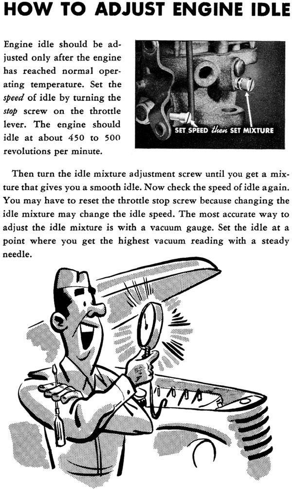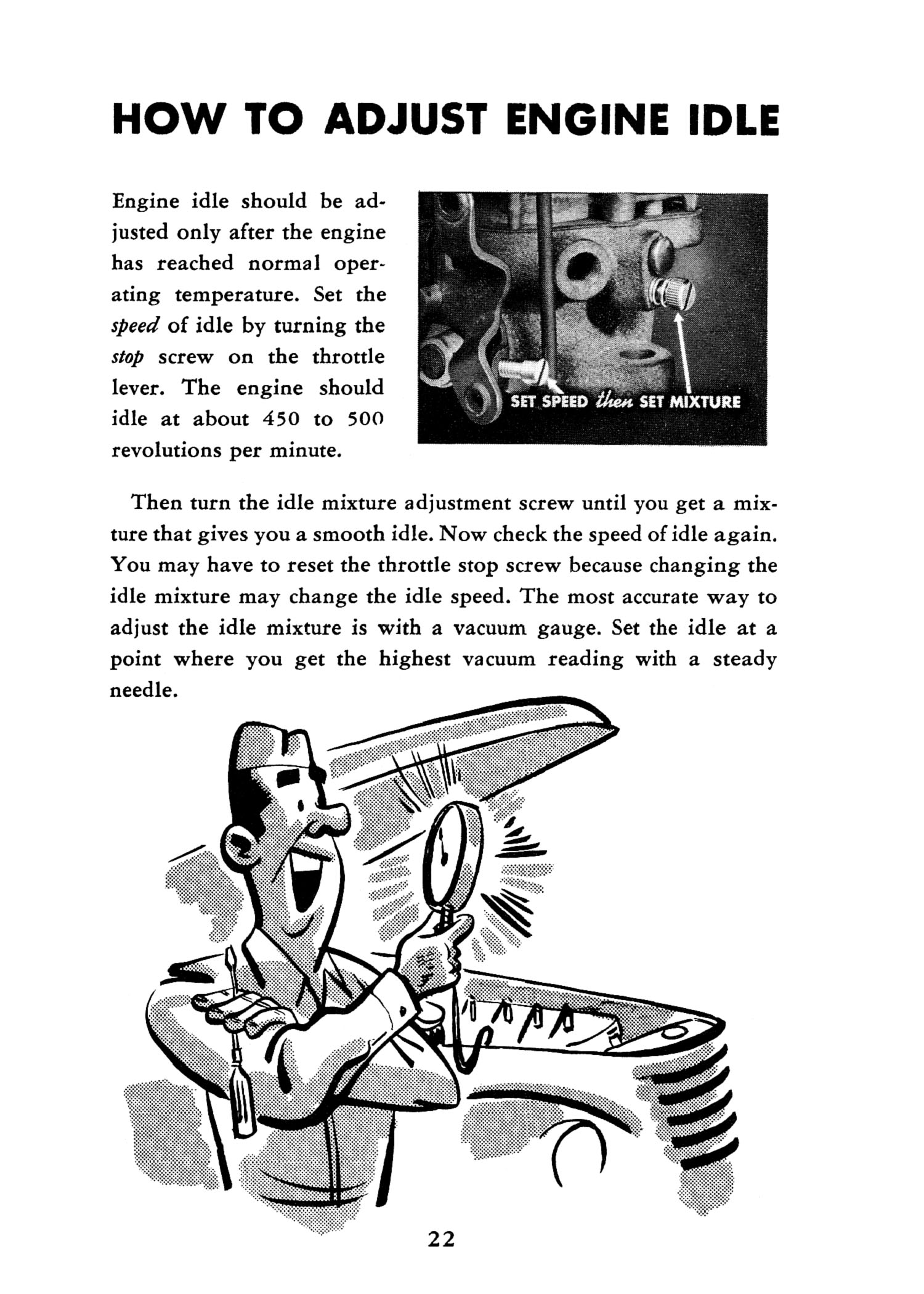 Front Cover Page 2 - Introduction To The Booklet Page 3 - Looking At The Whole Fuel System Page 4 - Fuel Tank and Filter Page 5 - Fuel Pump Page 6 - The Air Cleaner Page 7 - Gasoline + Air = Power Page 8 - Your Engine Is Really An Air Pump Page 9 - More About Carburetor Fundamentals Page 10 - What The Float System Does Page 11 - Other Causes Of High Fuel Levels Page 12 - The Main Metering System Page 13 - What The Throttle Valve Does Page 14 - Main Air Bleed Page 15 - Leaner Than Jet Standards Page 16 - Main Metering Jets Troubleshooting Page 17 - Ball & Ball Carburetors Set-Up Page 18 - Stromberg Carburetor Set-Up Page 19 - More On The Stromberg Carburetor Page 20 - Idle & Low Speed System Page 21 - More On The Low Speed System Page 22 - How To Adjust Engine Idle Page 23 - How To Diagnose Trouble In The Idle System Page 24 - Where The Accelerator System Takes Over Page 25 - Accelerator Pump Troubleshooting Page 26 - Adjusting The Pump Stroke Page 27 - The Choke System Page 28 - Keeping It Clean Page 29 - More On Cleaning The Carburetor Page 30 - Dash-Pot Page 31 - The Kick Down Switch Back Cover & Booklet Questionnaire