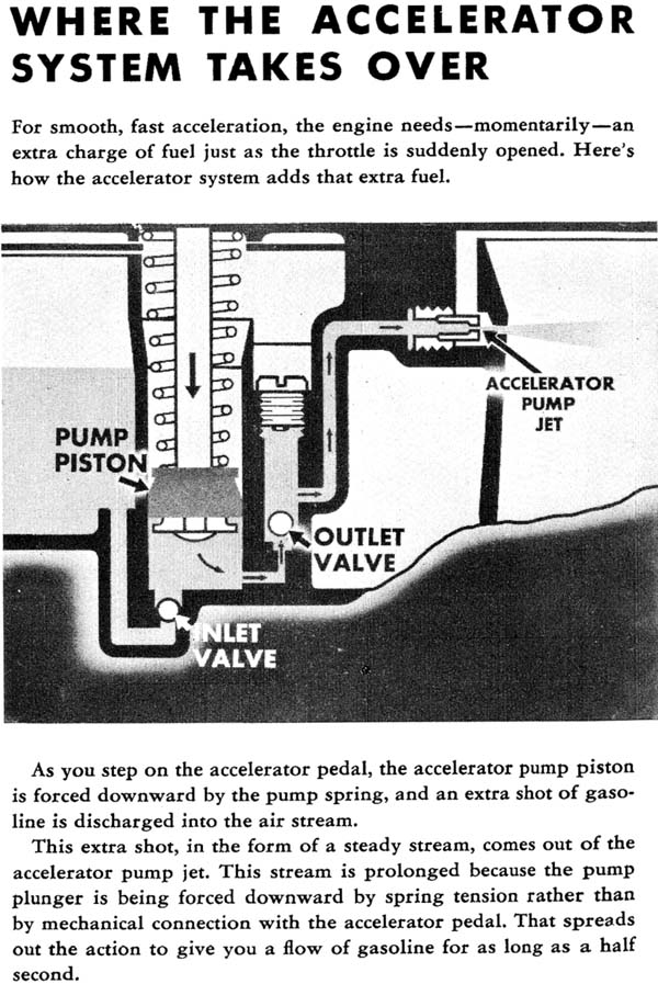 Front Cover Page 2 - Introduction To The Booklet Page 3 - Looking At The Whole Fuel System Page 4 - Fuel Tank and Filter Page 5 - Fuel Pump Page 6 - The Air Cleaner Page 7 - Gasoline + Air = Power Page 8 - Your Engine Is Really An Air Pump Page 9 - More About Carburetor Fundamentals Page 10 - What The Float System Does Page 11 - Other Causes Of High Fuel Levels Page 12 - The Main Metering System Page 13 - What The Throttle Valve Does Page 14 - Main Air Bleed Page 15 - Leaner Than Jet Standards Page 16 - Main Metering Jets Troubleshooting Page 17 - Ball & Ball Carburetors Set-Up Page 18 - Stromberg Carburetor Set-Up Page 19 - More On The Stromberg Carburetor Page 20 - Idle & Low Speed System Page 21 - More On The Low Speed System Page 22 - How To Adjust Engine Idle Page 23 - How To Diagnose Trouble In The Idle System Page 24 - Where The Accelerator System Takes Over Page 25 - Accelerator Pump Troubleshooting Page 26 - Adjusting The Pump Stroke Page 27 - The Choke System Page 28 - Keeping It Clean Page 29 - More On Cleaning The Carburetor Page 30 - Dash-Pot Page 31 - The Kick Down Switch Back Cover & Booklet Questionnaire