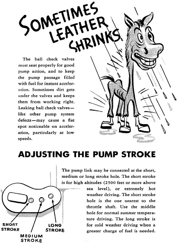 Front Cover Page 2 - Introduction To The Booklet Page 3 - Looking At The Whole Fuel System Page 4 - Fuel Tank and Filter Page 5 - Fuel Pump Page 6 - The Air Cleaner Page 7 - Gasoline + Air = Power Page 8 - Your Engine Is Really An Air Pump Page 9 - More About Carburetor Fundamentals Page 10 - What The Float System Does Page 11 - Other Causes Of High Fuel Levels Page 12 - The Main Metering System Page 13 - What The Throttle Valve Does Page 14 - Main Air Bleed Page 15 - Leaner Than Jet Standards Page 16 - Main Metering Jets Troubleshooting Page 17 - Ball & Ball Carburetors Set-Up Page 18 - Stromberg Carburetor Set-Up Page 19 - More On The Stromberg Carburetor Page 20 - Idle & Low Speed System Page 21 - More On The Low Speed System Page 22 - How To Adjust Engine Idle Page 23 - How To Diagnose Trouble In The Idle System Page 24 - Where The Accelerator System Takes Over Page 25 - Accelerator Pump Troubleshooting Page 26 - Adjusting The Pump Stroke Page 27 - The Choke System Page 28 - Keeping It Clean Page 29 - More On Cleaning The Carburetor Page 30 - Dash-Pot Page 31 - The Kick Down Switch Back Cover & Booklet Questionnaire