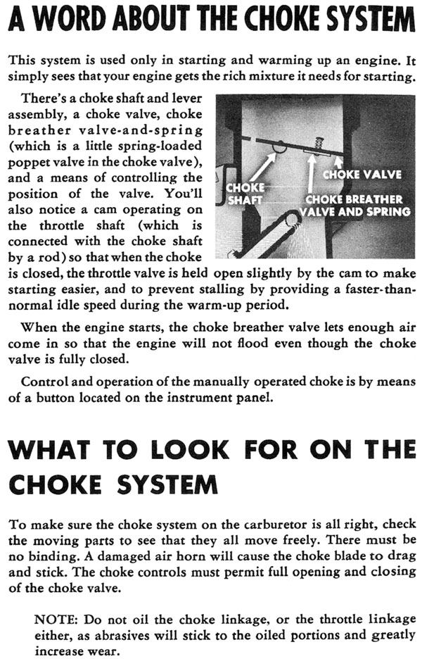 Front Cover Page 2 - Introduction To The Booklet Page 3 - Looking At The Whole Fuel System Page 4 - Fuel Tank and Filter Page 5 - Fuel Pump Page 6 - The Air Cleaner Page 7 - Gasoline + Air = Power Page 8 - Your Engine Is Really An Air Pump Page 9 - More About Carburetor Fundamentals Page 10 - What The Float System Does Page 11 - Other Causes Of High Fuel Levels Page 12 - The Main Metering System Page 13 - What The Throttle Valve Does Page 14 - Main Air Bleed Page 15 - Leaner Than Jet Standards Page 16 - Main Metering Jets Troubleshooting Page 17 - Ball & Ball Carburetors Set-Up Page 18 - Stromberg Carburetor Set-Up Page 19 - More On The Stromberg Carburetor Page 20 - Idle & Low Speed System Page 21 - More On The Low Speed System Page 22 - How To Adjust Engine Idle Page 23 - How To Diagnose Trouble In The Idle System Page 24 - Where The Accelerator System Takes Over Page 25 - Accelerator Pump Troubleshooting Page 26 - Adjusting The Pump Stroke Page 27 - The Choke System Page 28 - Keeping It Clean Page 29 - More On Cleaning The Carburetor Page 30 - Dash-Pot Page 31 - The Kick Down Switch Back Cover & Booklet Questionnaire