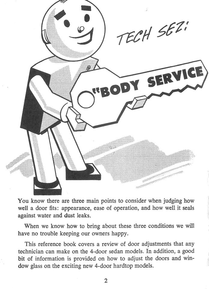 Front Cover Page 2 - Introduction Page 3 - Table of Contents Page 4 - Inspecting Fit of Door Page 5 - Adjusting the Doors - Sedan Models Page 6 - Adjusting the Doors - Sedan Models - Continued Page 7 - Adjusting the Doors - Sedan Models - Continued Page 8 - Adjusting the Doors - Sedan Models - Continued Page 9 - Adjusting the Doors - Hardtop Models - Continued Page 10 - Adjusting the Doors - Hardtop Models - Continued Page 11 - Adjusting the Doors - Hardtop Models - Continued Page 12 - Adjusting the Windows - Hardtop Models Page 13 - Adjusting the Windows - Hardtop Models - Continued Page 14 - Adjusting the Windows - Hardtop Models - Continued Page 15 - Adjusting the Windows - Hardtop Models - Continued Page 16 - Adjusting the Windows - Hardtop Models - Continued Page 17 - Adjusting the Windows - Hardtop Models - Continued Page 18 - Adjusting the Windows - Hardtop Models - Continued Page 19 - Adjusting the Windows - Hardtop Models - Continued Page 20 - Adjusting the Windows - Hardtop Models - Continued Page 21 - Adjusting the Windows - Hardtop Models - Continued Page 22 - Adjusting the Windows - Hardtop Models - Continued Page 23 - Summary Back Cover