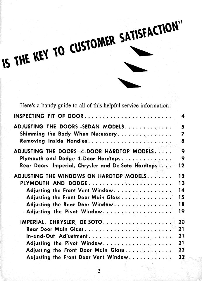 Move your way through the 1956 Door and Window Adjustments Reference Guide by choosing your next page. You are currently on Page 3.