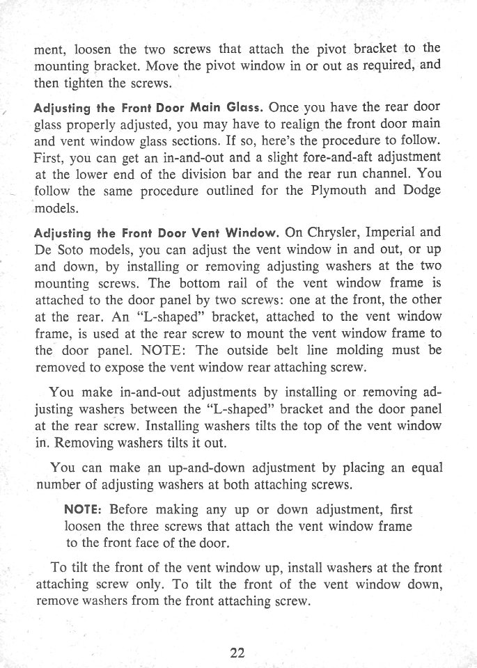 Move your way through the 1956 Door and Window Adjustments Reference Guide by choosing your next page. You are currently on Page 22.