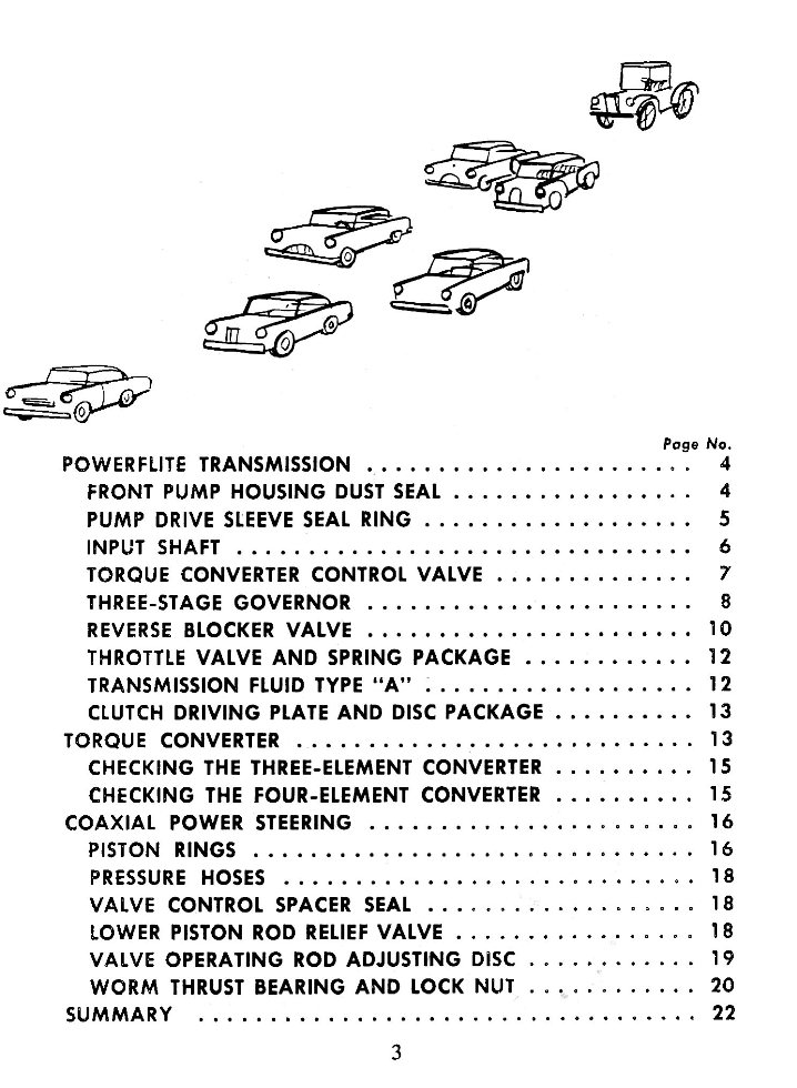 Front Cover Page 2 - Introduction Page 3 - Table of Contents Page 4 - Powerflite Transmission - Front Pump Housing Dust Seal Page 5 - Pump Drive Sleeve Seal Ring Page 6 - Input Shaft Page 7 - Torque Converter Control Valve Page 8 - The 3-Stage Governor Page 9 - The 3-Stage Governor Continued Page 10 - Reverse Blocker Valve Page 11 - Reverse Blocker Valve Continued Page 12 - Throttle Valve and Spring Package Page 13 - Torque Converter Page 14 - Torque Converter Continued Page 15 - Checking the 3-Element Converter Page 16 - Coaxial Power Steering Page 17 - Coaxial Power Steering Continued Page 18 - Pressure Hoses Page 19 - Valve Operating Adjustment Disc Page 20 - Warm Thrust Bearing and Lock Nut Page 21 - Warm Thrust Bearing and Lock Nut Continued Page 22 - Summary Page 23 - Picture Back Cover