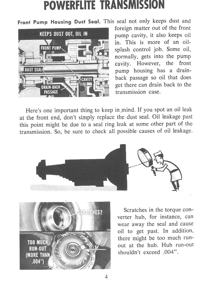 Front Cover Page 2 - Introduction Page 3 - Table of Contents Page 4 - Powerflite Transmission - Front Pump Housing Dust Seal Page 5 - Pump Drive Sleeve Seal Ring Page 6 - Input Shaft Page 7 - Torque Converter Control Valve Page 8 - The 3-Stage Governor Page 9 - The 3-Stage Governor Continued Page 10 - Reverse Blocker Valve Page 11 - Reverse Blocker Valve Continued Page 12 - Throttle Valve and Spring Package Page 13 - Torque Converter Page 14 - Torque Converter Continued Page 15 - Checking the 3-Element Converter Page 16 - Coaxial Power Steering Page 17 - Coaxial Power Steering Continued Page 18 - Pressure Hoses Page 19 - Valve Operating Adjustment Disc Page 20 - Warm Thrust Bearing and Lock Nut Page 21 - Warm Thrust Bearing and Lock Nut Continued Page 22 - Summary Page 23 - Picture Back Cover