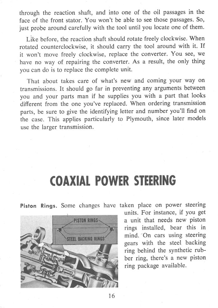 Front Cover Page 2 - Introduction Page 3 - Table of Contents Page 4 - Powerflite Transmission - Front Pump Housing Dust Seal Page 5 - Pump Drive Sleeve Seal Ring Page 6 - Input Shaft Page 7 - Torque Converter Control Valve Page 8 - The 3-Stage Governor Page 9 - The 3-Stage Governor Continued Page 10 - Reverse Blocker Valve Page 11 - Reverse Blocker Valve Continued Page 12 - Throttle Valve and Spring Package Page 13 - Torque Converter Page 14 - Torque Converter Continued Page 15 - Checking the 3-Element Converter Page 16 - Coaxial Power Steering Page 17 - Coaxial Power Steering Continued Page 18 - Pressure Hoses Page 19 - Valve Operating Adjustment Disc Page 20 - Warm Thrust Bearing and Lock Nut Page 21 - Warm Thrust Bearing and Lock Nut Continued Page 22 - Summary Page 23 - Picture Back Cover