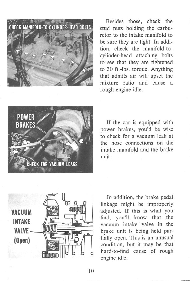 Front cover page 2 - Table of Contents page 3 - Factors Affecting Smooth Engine Idle Performance - General page 4 - Factors Affecting Smooth Engine Idle Performance - Ignition page 5 - Factors Affecting Smooth Engine Idle Performance - Ignition Continued page 6 - Factors Affecting Smooth Engine Idle Performance - Ignition Continued page 7 - Factors Affecting Smooth Engine Idle Performance - Ignition Continued page 8 - Factors Affecting Smooth Engine Idle Performance - Manifold Heat Control Valve page 9 - Factors Affecting Smooth Engine Idle Performance - Air Leaks page 10 - Factors Affecting Smooth Engine Idle Performance - Air Leaks Continued page 11 - Carburetor Maintenance page 12 - Carburetor Maintenance - Automatic Choke page 13 - Carburetor Maintenance - Idle Speed Adjustment page 14 - Carburetor Maintenance - Fast Idle Adjustment page 15 - Carburetor Maintenance - Throttle Valves page 16 - Loading Condition - 4-Barrel Carburetor page 17 - Loading Condition - 4-Barrel Carburetor Continued page 18 - Loading Condition - 4-Barrel Carburetor Continued page 19 - Surging Condition - 30 to 40 MPH Constant Speed page 20 - Hesitation on Acceleration page 21 - Hesitation on Acceleration Continued page 22 - The Accelerator Pump System - Two-Barrel Carburetor page 23 - The Accelerator Pump System - Two-Barrel Carburetor Continued page 24 - The Accelerator Pump System - Four-Barrel Carburetor page 25 - Cutting Out Or Stalling on Turns - Four-Barrel Carburetor page 26 - Cutting Out Or Stalling on Turns - Four-Barrel Carburetor Continued page 27 - Four-Barrel Carburetor Secondary Throttle Valves - Chrysler, DeSoto page 28 - Four-Barrel Carburetor Secondary Throttle Valves - Chrysler, DeSoto Continued page 29 - Secondary Throttle Valves - Plymouth and Dodge page 30 - Secondary Throttle Valves - Plymouth and Dodge page 31 - Summary back cover