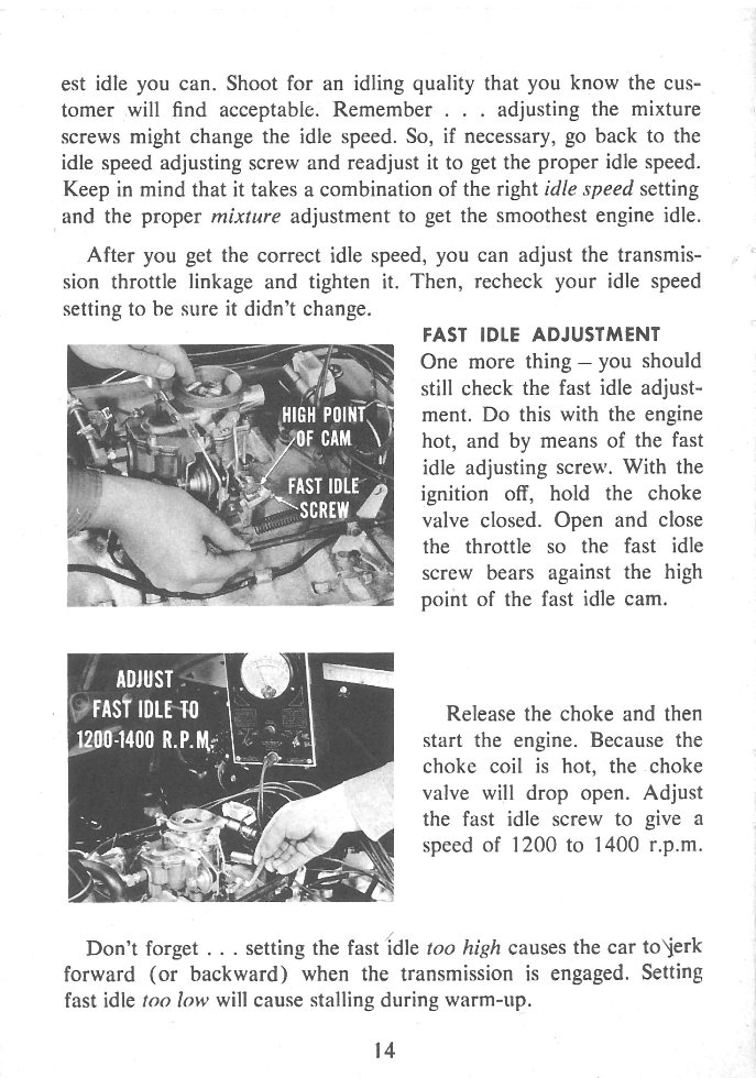Front cover page 2 - Table of Contents page 3 - Factors Affecting Smooth Engine Idle Performance - General page 4 - Factors Affecting Smooth Engine Idle Performance - Ignition page 5 - Factors Affecting Smooth Engine Idle Performance - Ignition Continued page 6 - Factors Affecting Smooth Engine Idle Performance - Ignition Continued page 7 - Factors Affecting Smooth Engine Idle Performance - Ignition Continued page 8 - Factors Affecting Smooth Engine Idle Performance - Manifold Heat Control Valve page 9 - Factors Affecting Smooth Engine Idle Performance - Air Leaks page 10 - Factors Affecting Smooth Engine Idle Performance - Air Leaks Continued page 11 - Carburetor Maintenance page 12 - Carburetor Maintenance - Automatic Choke page 13 - Carburetor Maintenance - Idle Speed Adjustment page 14 - Carburetor Maintenance - Fast Idle Adjustment page 15 - Carburetor Maintenance - Throttle Valves page 16 - Loading Condition - 4-Barrel Carburetor page 17 - Loading Condition - 4-Barrel Carburetor Continued page 18 - Loading Condition - 4-Barrel Carburetor Continued page 19 - Surging Condition - 30 to 40 MPH Constant Speed page 20 - Hesitation on Acceleration page 21 - Hesitation on Acceleration Continued page 22 - The Accelerator Pump System - Two-Barrel Carburetor page 23 - The Accelerator Pump System - Two-Barrel Carburetor Continued page 24 - The Accelerator Pump System - Four-Barrel Carburetor page 25 - Cutting Out Or Stalling on Turns - Four-Barrel Carburetor page 26 - Cutting Out Or Stalling on Turns - Four-Barrel Carburetor Continued page 27 - Four-Barrel Carburetor Secondary Throttle Valves - Chrysler, DeSoto page 28 - Four-Barrel Carburetor Secondary Throttle Valves - Chrysler, DeSoto Continued page 29 - Secondary Throttle Valves - Plymouth and Dodge page 30 - Secondary Throttle Valves - Plymouth and Dodge page 31 - Summary back cover