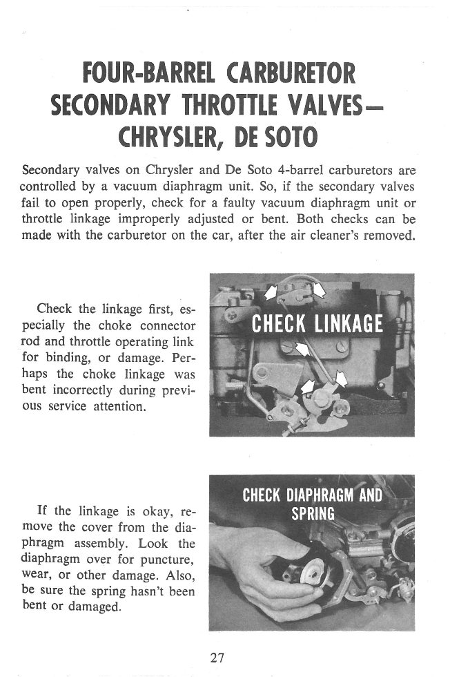 Front cover page 2 - Table of Contents page 3 - Factors Affecting Smooth Engine Idle Performance - General page 4 - Factors Affecting Smooth Engine Idle Performance - Ignition page 5 - Factors Affecting Smooth Engine Idle Performance - Ignition Continued page 6 - Factors Affecting Smooth Engine Idle Performance - Ignition Continued page 7 - Factors Affecting Smooth Engine Idle Performance - Ignition Continued page 8 - Factors Affecting Smooth Engine Idle Performance - Manifold Heat Control Valve page 9 - Factors Affecting Smooth Engine Idle Performance - Air Leaks page 10 - Factors Affecting Smooth Engine Idle Performance - Air Leaks Continued page 11 - Carburetor Maintenance page 12 - Carburetor Maintenance - Automatic Choke page 13 - Carburetor Maintenance - Idle Speed Adjustment page 14 - Carburetor Maintenance - Fast Idle Adjustment page 15 - Carburetor Maintenance - Throttle Valves page 16 - Loading Condition - 4-Barrel Carburetor page 17 - Loading Condition - 4-Barrel Carburetor Continued page 18 - Loading Condition - 4-Barrel Carburetor Continued page 19 - Surging Condition - 30 to 40 MPH Constant Speed page 20 - Hesitation on Acceleration page 21 - Hesitation on Acceleration Continued page 22 - The Accelerator Pump System - Two-Barrel Carburetor page 23 - The Accelerator Pump System - Two-Barrel Carburetor Continued page 24 - The Accelerator Pump System - Four-Barrel Carburetor page 25 - Cutting Out Or Stalling on Turns - Four-Barrel Carburetor page 26 - Cutting Out Or Stalling on Turns - Four-Barrel Carburetor Continued page 27 - Four-Barrel Carburetor Secondary Throttle Valves - Chrysler, DeSoto page 28 - Four-Barrel Carburetor Secondary Throttle Valves - Chrysler, DeSoto Continued page 29 - Secondary Throttle Valves - Plymouth and Dodge page 30 - Secondary Throttle Valves - Plymouth and Dodge page 31 - Summary back cover