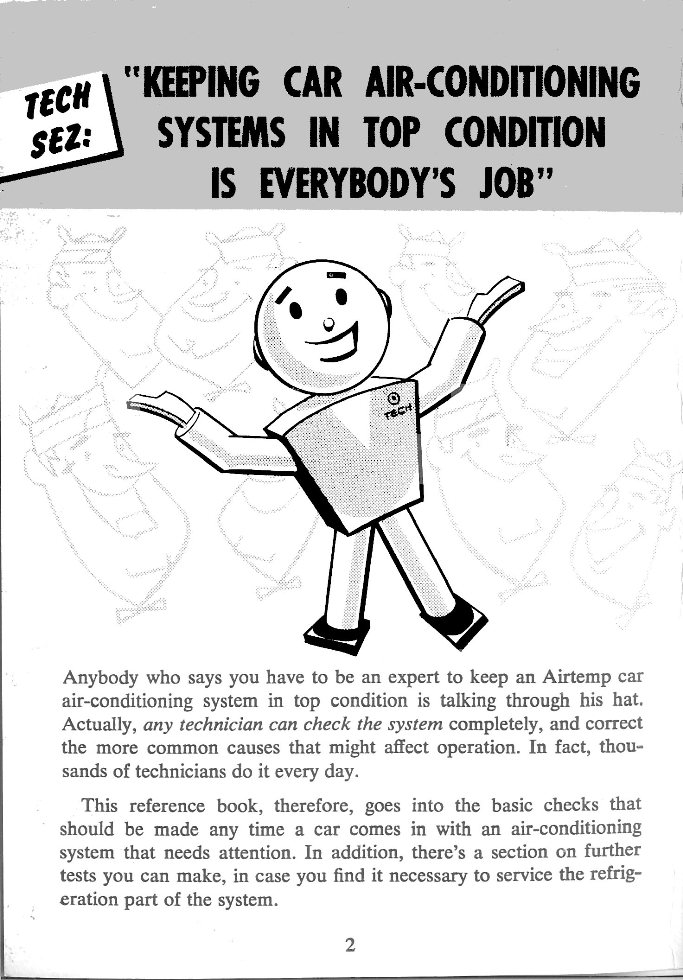 Front Cover Page 2 - Introduction Page 3 - Table of Contents Page 4 - Three Phases of Air-Conditioning Service - Operations of Controls Page 5 - Operation of Controls Continued Page 6 - Air Circulation Page 7 - Air Circulation Continued Page 8 - Refrigeration System Page 9 - Refrigeration System Continued Page 10 - Road Test the Car Page 11 - Test for Leaks Page 12 - Check the Compressor Page 13 - Check for Restrictions Page 14 - Check the Solenoid Valve Page 15 - Check the Solenoid Continued Page 16 - Check the Expansion Valve Page 17 - Refrigeration System Service Page 18 - How to Discharge the System Page 19 - Discharge Diagram Page 20 - Evacuate the System Page 21 - The Sweep-Test Charge Page 22 - Charging the System Page 23 - Compressor Capacity Test Page 24 - Thermal Switch and Solenoid Test Page 25 - Super Heat Test Page 26 - Super Heat Test Continued Page 27 - Super Heat Determination Chart Back Cover