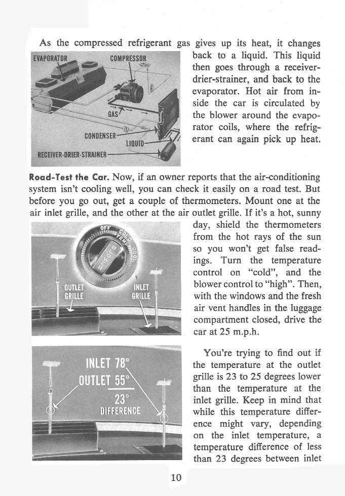 Front Cover Page 2 - Introduction Page 3 - Table of Contents Page 4 - Three Phases of Air-Conditioning Service - Operations of Controls Page 5 - Operation of Controls Continued Page 6 - Air Circulation Page 7 - Air Circulation Continued Page 8 - Refrigeration System Page 9 - Refrigeration System Continued Page 10 - Road Test the Car Page 11 - Test for Leaks Page 12 - Check the Compressor Page 13 - Check for Restrictions Page 14 - Check the Solenoid Valve Page 15 - Check the Solenoid Continued Page 16 - Check the Expansion Valve Page 17 - Refrigeration System Service Page 18 - How to Discharge the System Page 19 - Discharge Diagram Page 20 - Evacuate the System Page 21 - The Sweep-Test Charge Page 22 - Charging the System Page 23 - Compressor Capacity Test Page 24 - Thermal Switch and Solenoid Test Page 25 - Super Heat Test Page 26 - Super Heat Test Continued Page 27 - Super Heat Determination Chart Back Cover