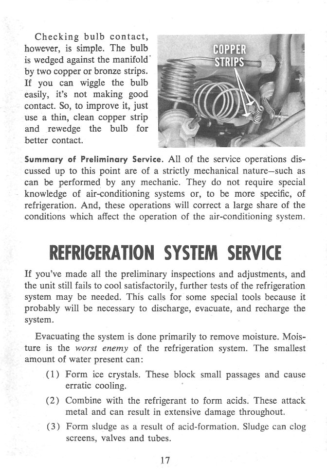 Front Cover Page 2 - Introduction Page 3 - Table of Contents Page 4 - Three Phases of Air-Conditioning Service - Operations of Controls Page 5 - Operation of Controls Continued Page 6 - Air Circulation Page 7 - Air Circulation Continued Page 8 - Refrigeration System Page 9 - Refrigeration System Continued Page 10 - Road Test the Car Page 11 - Test for Leaks Page 12 - Check the Compressor Page 13 - Check for Restrictions Page 14 - Check the Solenoid Valve Page 15 - Check the Solenoid Continued Page 16 - Check the Expansion Valve Page 17 - Refrigeration System Service Page 18 - How to Discharge the System Page 19 - Discharge Diagram Page 20 - Evacuate the System Page 21 - The Sweep-Test Charge Page 22 - Charging the System Page 23 - Compressor Capacity Test Page 24 - Thermal Switch and Solenoid Test Page 25 - Super Heat Test Page 26 - Super Heat Test Continued Page 27 - Super Heat Determination Chart Back Cover