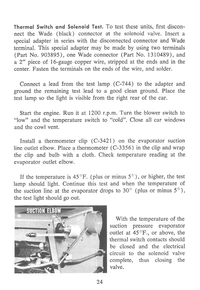 Front Cover Page 2 - Introduction Page 3 - Table of Contents Page 4 - Three Phases of Air-Conditioning Service - Operations of Controls Page 5 - Operation of Controls Continued Page 6 - Air Circulation Page 7 - Air Circulation Continued Page 8 - Refrigeration System Page 9 - Refrigeration System Continued Page 10 - Road Test the Car Page 11 - Test for Leaks Page 12 - Check the Compressor Page 13 - Check for Restrictions Page 14 - Check the Solenoid Valve Page 15 - Check the Solenoid Continued Page 16 - Check the Expansion Valve Page 17 - Refrigeration System Service Page 18 - How to Discharge the System Page 19 - Discharge Diagram Page 20 - Evacuate the System Page 21 - The Sweep-Test Charge Page 22 - Charging the System Page 23 - Compressor Capacity Test Page 24 - Thermal Switch and Solenoid Test Page 25 - Super Heat Test Page 26 - Super Heat Test Continued Page 27 - Super Heat Determination Chart Back Cover