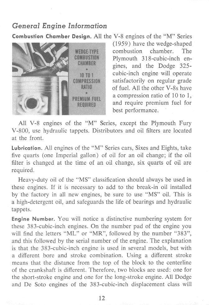 Front Cover Page 2 - Table of Contents Page 3 - Plymouth Engines Page 4 - Plymouth Engines Continued Page 5 - Plymouth Engines Continued Page 6 - Plymouth Engines Continued Page 7 - Dodge Engines Page 8 - Dodge Engines Continued Page 9 - Desoto Engines Page 10 - Chrysler Engines Page 11 - Chrysler Engines Continued Page 12 - General Engine Information Page 13 - Automatic Transmissions and Front Suspension Page 14 - Front Suspension Continued Page 15 - Front Suspension Continued Page 16 - Car-Leveling Device Page 17 - Car-Leveling Device Continued Page 18 - Hot Water Heater Page 19 - Air Conditioning Page 20 - Air Conditioning Continued Page 21 - Body Features Page 22 - Accessories Page 23 - Summary Back Cover