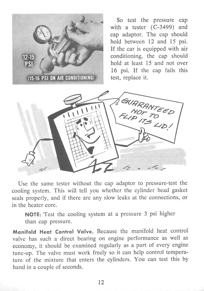 Front Cover Page 2 - Introduction Page 3 - Table of Contents Page 4 - High-Tension Cables Page 5 - Loose, Corroded Terminals Page 6 - Distributor Points Page 7 - Air Cleaner Page 8 - Air Cleaner - Continued Page 9 - Crankcase Ventilation and Drive Belts Page 10 - Drive Belt Tensions Page 11 - Cooling System Page 12 - Manifold Heat Control Valve Page 13 - Manifold Heat Control Valve Continued Page 14 - Carburetor Page 15 - Secondary Throttle Valve Operation and Fuel Economy and Hard Starting Page 16 - Poor Top Speed Performance Page 17 - Accelerator Pump Position and Transmission Throttle Linkage Adjustment Page 18 - Transmission Throttle Linkage Adjustment Continued Page 19 - A Closing Word Back Cover