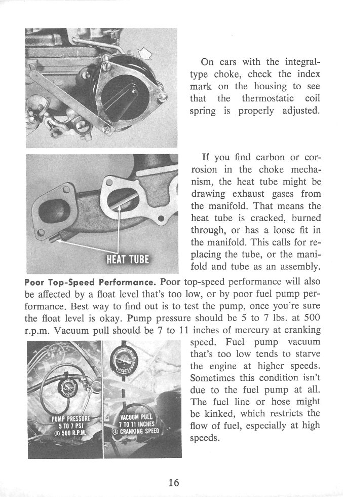 Front Cover Page 2 - Introduction Page 3 - Table of Contents Page 4 - High-Tension Cables Page 5 - Loose, Corroded Terminals Page 6 - Distributor Points Page 7 - Air Cleaner Page 8 - Air Cleaner - Continued Page 9 - Crankcase Ventilation and Drive Belts Page 10 - Drive Belt Tensions Page 11 - Cooling System Page 12 - Manifold Heat Control Valve Page 13 - Manifold Heat Control Valve Continued Page 14 - Carburetor Page 15 - Secondary Throttle Valve Operation and Fuel Economy and Hard Starting Page 16 - Poor Top Speed Performance Page 17 - Accelerator Pump Position and Transmission Throttle Linkage Adjustment Page 18 - Transmission Throttle Linkage Adjustment Continued Page 19 - A Closing Word Back Cover