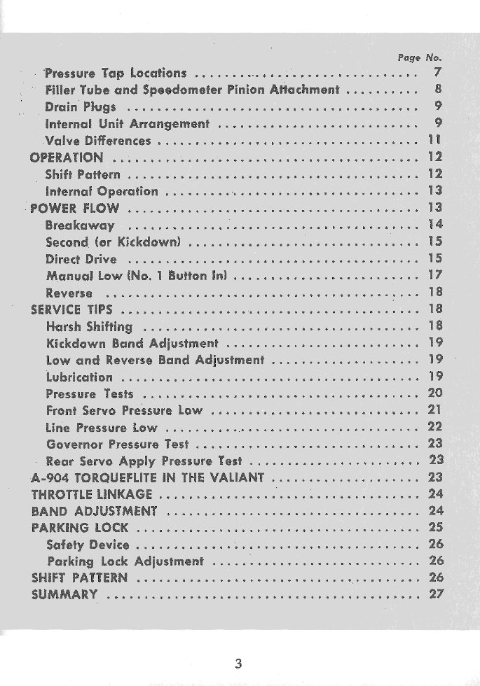 Move your way through the A-904 Torqueflite Automatic Transmission Service Reference Guide by choosing your next page. You are currently on the Page 3.