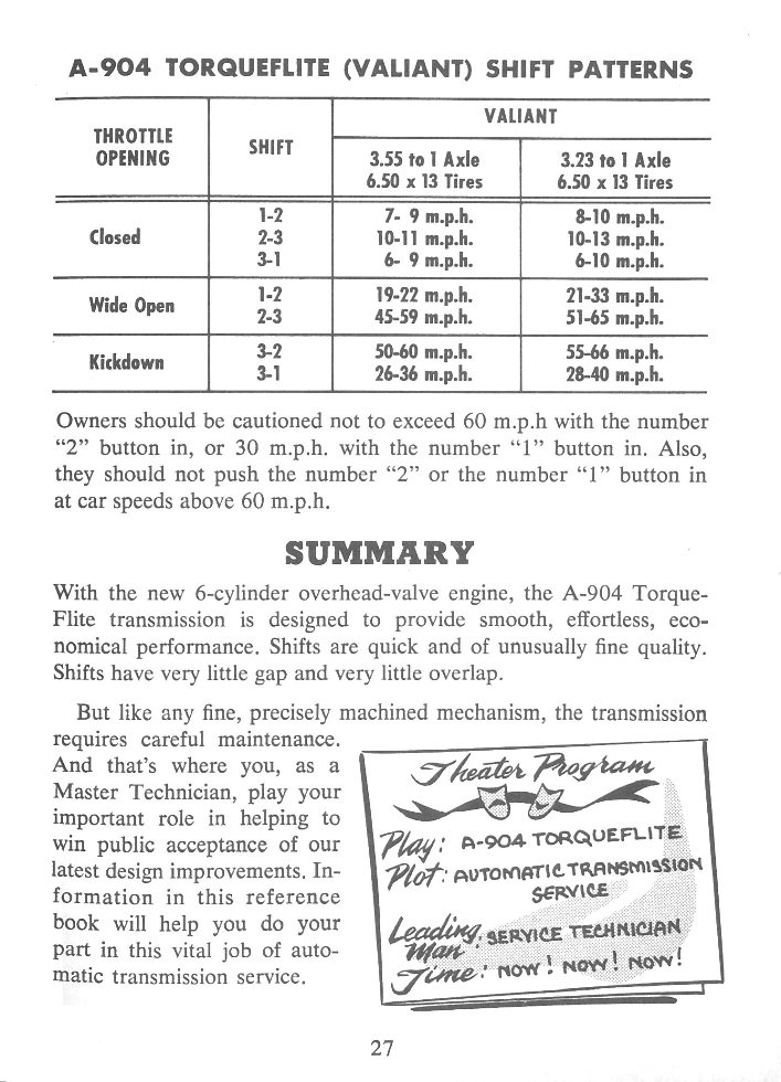 Move your way through the A-904 Torqueflite Automatic Transmission Service Reference Guide by choosing your next page. You are currently on the Page 27.