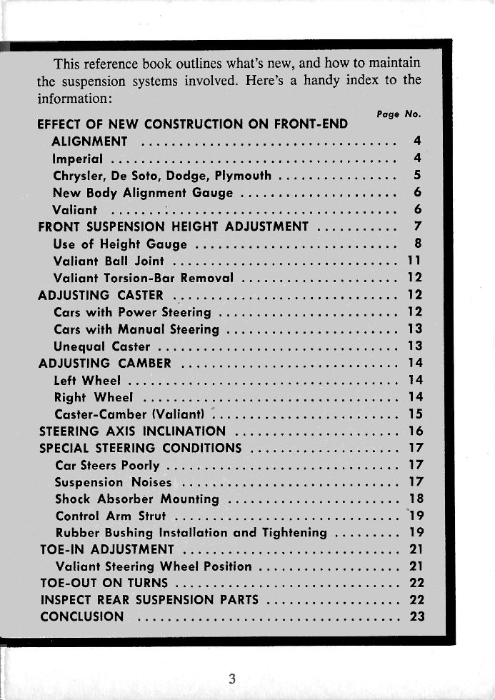 Front Cover Page 2 - For An Owner's Delight Page 3 - Table of Contents Page 4 - Effect of New Construction on Front-End Alignment Page 5 -Chrysler, DeSoto, Dodge, Plymouth Page 6 - Valiant Page 7 - Front Suspension Height Adjustment Page 8 - Front Suspension Height Adjustment Continued Page 9 - Front Suspension Height Adjustment Continued Page 10 - Front Suspension Height Adjustment Continued Page 11 - Front Suspension Height Adjustment Continued Page 12 - Adjusting Caster Page 13 - Adjusting Caster Continued Page 14 - Adjusting Camber Page 15 - Adjusting Camber Continued Page 16 - Steering Axis Inclination Page 17 - Special Steering Conditions Page 18 - Special Steering Conditions Continued Page 19 - Special Steering Conditions Continued Page 20 - Special Steering Conditions Continued Page 21 - Toe-In Adjustment Page 22 - Toe-Out On Turns Page 23 - Conclusion Back Cover