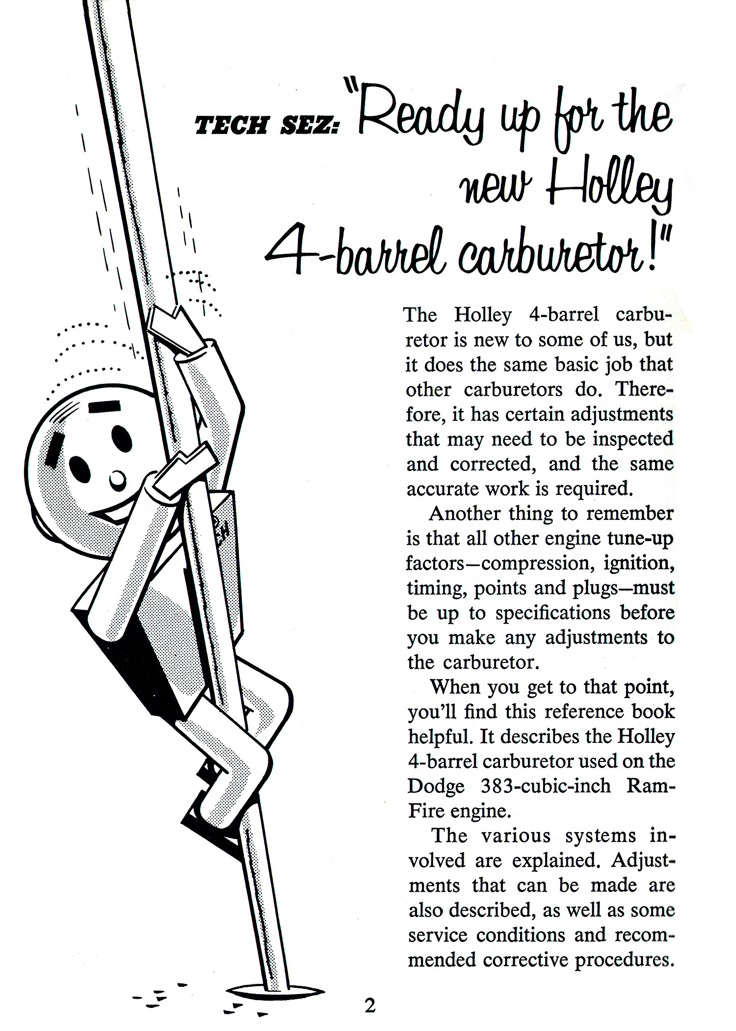 Front Cover Page 2 - Tech Sez Page 3 - General Page 4 - Choke Page 5 - Fuel Systems Page 6 - Power Valve & Accelerating Pump Page 7 - Idle Bypass Page 8 - Flow Systems Page 9 - Primary & Secondary Bowls Page 10 - Float and Valve & Seat Assembly Page 11 - Primary Idle System Page 12 - Fuel Mixture Adjustment Page 13 - Idle Bypass System Page 14 - Secondary Idle System Page 15 - Primary Main Metering System Page 16 - Secondary Main Metering System Page 17 - Power Enrichment System Page 18 - The Power Valve Page 19 - Accelerating Pump System Page 20 - Carburetor Adjustments Page 21 - Idle Mixture & Air-Speed Adjustment Page 22 - Adjusting The Carburetor Off the Car Page 23 - Choke Adjustment Page 24 - Troubleshooting Tips Page 25 - Troubleshooting Tips (cont'd) Page 26 - Troubleshooting Tips (cont'd) Page 27 - A Final Word Back Cover