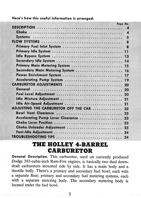 Front Cover Page 2 - Tech Sez Page 3 - General Page 4 - Choke Page 5 - Fuel Systems Page 6 - Power Valve & Accelerating Pump Page 7 - Idle Bypass Page 8 - Flow Systems Page 9 - Primary & Secondary Bowls Page 10 - Float and Valve & Seat Assembly Page 11 - Primary Idle System Page 12 - Fuel Mixture Adjustment Page 13 - Idle Bypass System Page 14 - Secondary Idle System Page 15 - Primary Main Metering System Page 16 - Secondary Main Metering System Page 17 - Power Enrichment System Page 18 - The Power Valve Page 19 - Accelerating Pump System Page 20 - Carburetor Adjustments Page 21 - Idle Mixture & Air-Speed Adjustment Page 22 - Adjusting The Carburetor Off the Car Page 23 - Choke Adjustment Page 24 - Troubleshooting Tips Page 25 - Troubleshooting Tips (cont'd) Page 26 - Troubleshooting Tips (cont'd) Page 27 - A Final Word Back Cover