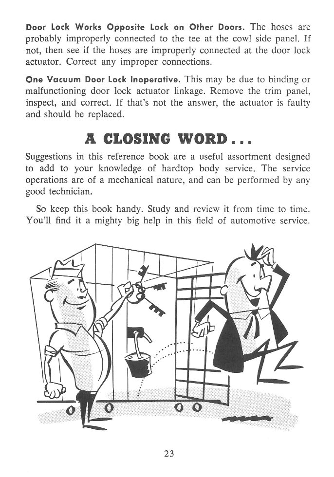Front Cover Page 2 - Table of Contents Page 3 - Door Alignment Page 4 - Door Alignment - Four Door Hardtop Page 5 - Door Alignment - Convertible Page 6 - Window Alignment - Four Door Hardtop Page 7 - Window Alignment - Four Door - Continued Page 8 - Window Alignment - Four Door - Continued Page 9 - Window Alignment - Four Door - Continued Page 10 - Window Alignment - Four Door - Continued Page 11 - Window Alignment - Two Door Page 12 - Door Lock and Linkage Service - Lubrication Page 13 - Door Lock and Linkage Service - Diagnosis Page 14 - Door Lock and Linkage Service - Diagnosis - Continued Page 15 - Door Lock and Linkage Service - Diagnosis - Continued Page 16 - Door Lock and Linkage Service - Diagnosis - Continued Page 17 - Door Lock and Linkage Service - Diagnosis - Continued Page 18 - Vacuum Door Lock Service - Operation Page 19 - Vacuum Door Lock Service - Diagnosis Page 20 - Vacuum Door Lock Service - Diagnosis - Continued Page 21 - Vacuum Door Lock Service - Diagnosis - Continued Page 22 - Vacuum Door Lock Service - Diagnosis - Continued Page 23 - A Closing Word Back Cover