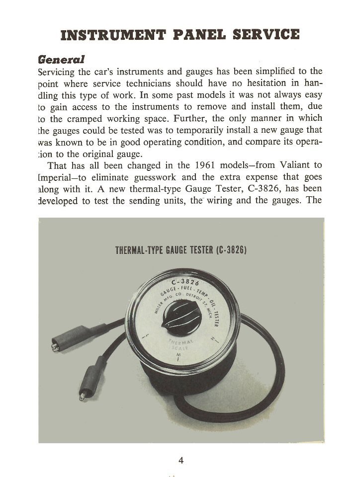Front cover page 2 - There's a new look up front page 3 - Table of contents page 4 - General Information on Instrument Panel Service page 5 - Gauge Testing Procedures page 6 - Testing the Temperature Gauge Sending Unit page 7 - Testing the Oil Pressure Sending Unit page 8 - Testing the Oil Pressure Sending Unit continued page 9 - Testing the Fuel Gauge Sending Unit page 10 - Testing the Fuel Gauge Sending Unit continued page 11 - Gauge Voltage Regulators page 12 - External-Type Voltage Regulator page 13 - Internal-Type Voltage Regulator page 14 - Testing Panel Gauges - Plymouth page 15 - Testing Panel Gauges continued- Plymouth page 16 - Testing Panel Gauges continued - Chrysler page 17 - Testing Panel Gauges continued - All Other Models page 18 - Testing Panel Gauges continued - All Other Models page 19 - Cluster Removal - Valiant page 20 - Cluster Removal continued - Valiant page 21 - Cluster Removal - Lancer page 22 - Cluster Removal - Plymouth page 23 - Cluster Removal - Dart, Polara and DeSoto page 24 - Cluster Removal continued - Dart, Polara and DeSoto page 25 - Cluster Removal continued - Dart, Polara and DeSoto page 26 - Cluster Removal continued - Dart, Polara and DeSoto page 27 - Cluster Removal continued - Dart, Polara and DeSoto page 28 - Cluster Removal - Chrysler page 29 - Cluster Removal continued - Chrysler page 30 - Cluster Removal continued - Chrysler page 31 - Conclusion back cover
