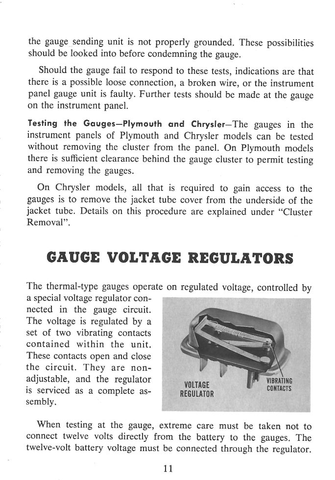 Front cover page 2 - There's a new look up front page 3 - Table of contents page 4 - General Information on Instrument Panel Service page 5 - Gauge Testing Procedures page 6 - Testing the Temperature Gauge Sending Unit page 7 - Testing the Oil Pressure Sending Unit page 8 - Testing the Oil Pressure Sending Unit continued page 9 - Testing the Fuel Gauge Sending Unit page 10 - Testing the Fuel Gauge Sending Unit continued page 11 - Gauge Voltage Regulators page 12 - External-Type Voltage Regulator page 13 - Internal-Type Voltage Regulator page 14 - Testing Panel Gauges - Plymouth page 15 - Testing Panel Gauges continued- Plymouth page 16 - Testing Panel Gauges continued - Chrysler page 17 - Testing Panel Gauges continued - All Other Models page 18 - Testing Panel Gauges continued - All Other Models page 19 - Cluster Removal - Valiant page 20 - Cluster Removal continued - Valiant page 21 - Cluster Removal - Lancer page 22 - Cluster Removal - Plymouth page 23 - Cluster Removal - Dart, Polara and DeSoto page 24 - Cluster Removal continued - Dart, Polara and DeSoto page 25 - Cluster Removal continued - Dart, Polara and DeSoto page 26 - Cluster Removal continued - Dart, Polara and DeSoto page 27 - Cluster Removal continued - Dart, Polara and DeSoto page 28 - Cluster Removal - Chrysler page 29 - Cluster Removal continued - Chrysler page 30 - Cluster Removal continued - Chrysler page 31 - Conclusion back cover