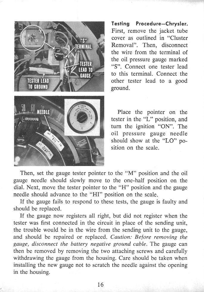 Front cover page 2 - There's a new look up front page 3 - Table of contents page 4 - General Information on Instrument Panel Service page 5 - Gauge Testing Procedures page 6 - Testing the Temperature Gauge Sending Unit page 7 - Testing the Oil Pressure Sending Unit page 8 - Testing the Oil Pressure Sending Unit continued page 9 - Testing the Fuel Gauge Sending Unit page 10 - Testing the Fuel Gauge Sending Unit continued page 11 - Gauge Voltage Regulators page 12 - External-Type Voltage Regulator page 13 - Internal-Type Voltage Regulator page 14 - Testing Panel Gauges - Plymouth page 15 - Testing Panel Gauges continued- Plymouth page 16 - Testing Panel Gauges continued - Chrysler page 17 - Testing Panel Gauges continued - All Other Models page 18 - Testing Panel Gauges continued - All Other Models page 19 - Cluster Removal - Valiant page 20 - Cluster Removal continued - Valiant page 21 - Cluster Removal - Lancer page 22 - Cluster Removal - Plymouth page 23 - Cluster Removal - Dart, Polara and DeSoto page 24 - Cluster Removal continued - Dart, Polara and DeSoto page 25 - Cluster Removal continued - Dart, Polara and DeSoto page 26 - Cluster Removal continued - Dart, Polara and DeSoto page 27 - Cluster Removal continued - Dart, Polara and DeSoto page 28 - Cluster Removal - Chrysler page 29 - Cluster Removal continued - Chrysler page 30 - Cluster Removal continued - Chrysler page 31 - Conclusion back cover