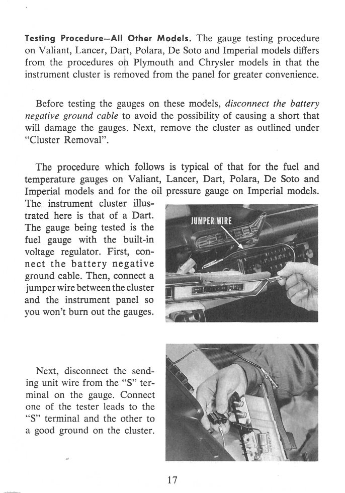 Front cover page 2 - There's a new look up front page 3 - Table of contents page 4 - General Information on Instrument Panel Service page 5 - Gauge Testing Procedures page 6 - Testing the Temperature Gauge Sending Unit page 7 - Testing the Oil Pressure Sending Unit page 8 - Testing the Oil Pressure Sending Unit continued page 9 - Testing the Fuel Gauge Sending Unit page 10 - Testing the Fuel Gauge Sending Unit continued page 11 - Gauge Voltage Regulators page 12 - External-Type Voltage Regulator page 13 - Internal-Type Voltage Regulator page 14 - Testing Panel Gauges - Plymouth page 15 - Testing Panel Gauges continued- Plymouth page 16 - Testing Panel Gauges continued - Chrysler page 17 - Testing Panel Gauges continued - All Other Models page 18 - Testing Panel Gauges continued - All Other Models page 19 - Cluster Removal - Valiant page 20 - Cluster Removal continued - Valiant page 21 - Cluster Removal - Lancer page 22 - Cluster Removal - Plymouth page 23 - Cluster Removal - Dart, Polara and DeSoto page 24 - Cluster Removal continued - Dart, Polara and DeSoto page 25 - Cluster Removal continued - Dart, Polara and DeSoto page 26 - Cluster Removal continued - Dart, Polara and DeSoto page 27 - Cluster Removal continued - Dart, Polara and DeSoto page 28 - Cluster Removal - Chrysler page 29 - Cluster Removal continued - Chrysler page 30 - Cluster Removal continued - Chrysler page 31 - Conclusion back cover