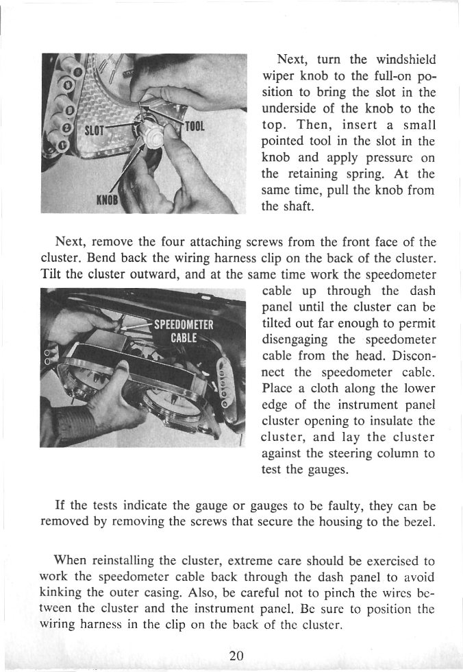 Front cover page 2 - There's a new look up front page 3 - Table of contents page 4 - General Information on Instrument Panel Service page 5 - Gauge Testing Procedures page 6 - Testing the Temperature Gauge Sending Unit page 7 - Testing the Oil Pressure Sending Unit page 8 - Testing the Oil Pressure Sending Unit continued page 9 - Testing the Fuel Gauge Sending Unit page 10 - Testing the Fuel Gauge Sending Unit continued page 11 - Gauge Voltage Regulators page 12 - External-Type Voltage Regulator page 13 - Internal-Type Voltage Regulator page 14 - Testing Panel Gauges - Plymouth page 15 - Testing Panel Gauges continued- Plymouth page 16 - Testing Panel Gauges continued - Chrysler page 17 - Testing Panel Gauges continued - All Other Models page 18 - Testing Panel Gauges continued - All Other Models page 19 - Cluster Removal - Valiant page 20 - Cluster Removal continued - Valiant page 21 - Cluster Removal - Lancer page 22 - Cluster Removal - Plymouth page 23 - Cluster Removal - Dart, Polara and DeSoto page 24 - Cluster Removal continued - Dart, Polara and DeSoto page 25 - Cluster Removal continued - Dart, Polara and DeSoto page 26 - Cluster Removal continued - Dart, Polara and DeSoto page 27 - Cluster Removal continued - Dart, Polara and DeSoto page 28 - Cluster Removal - Chrysler page 29 - Cluster Removal continued - Chrysler page 30 - Cluster Removal continued - Chrysler page 31 - Conclusion back cover