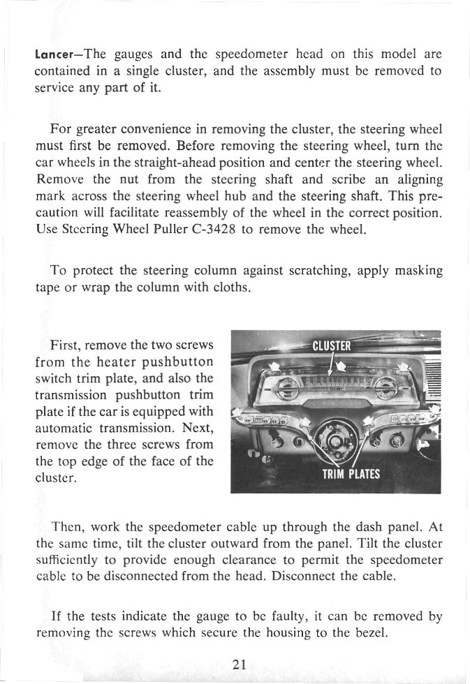 Front cover page 2 - There's a new look up front page 3 - Table of contents page 4 - General Information on Instrument Panel Service page 5 - Gauge Testing Procedures page 6 - Testing the Temperature Gauge Sending Unit page 7 - Testing the Oil Pressure Sending Unit page 8 - Testing the Oil Pressure Sending Unit continued page 9 - Testing the Fuel Gauge Sending Unit page 10 - Testing the Fuel Gauge Sending Unit continued page 11 - Gauge Voltage Regulators page 12 - External-Type Voltage Regulator page 13 - Internal-Type Voltage Regulator page 14 - Testing Panel Gauges - Plymouth page 15 - Testing Panel Gauges continued- Plymouth page 16 - Testing Panel Gauges continued - Chrysler page 17 - Testing Panel Gauges continued - All Other Models page 18 - Testing Panel Gauges continued - All Other Models page 19 - Cluster Removal - Valiant page 20 - Cluster Removal continued - Valiant page 21 - Cluster Removal - Lancer page 22 - Cluster Removal - Plymouth page 23 - Cluster Removal - Dart, Polara and DeSoto page 24 - Cluster Removal continued - Dart, Polara and DeSoto page 25 - Cluster Removal continued - Dart, Polara and DeSoto page 26 - Cluster Removal continued - Dart, Polara and DeSoto page 27 - Cluster Removal continued - Dart, Polara and DeSoto page 28 - Cluster Removal - Chrysler page 29 - Cluster Removal continued - Chrysler page 30 - Cluster Removal continued - Chrysler page 31 - Conclusion back cover