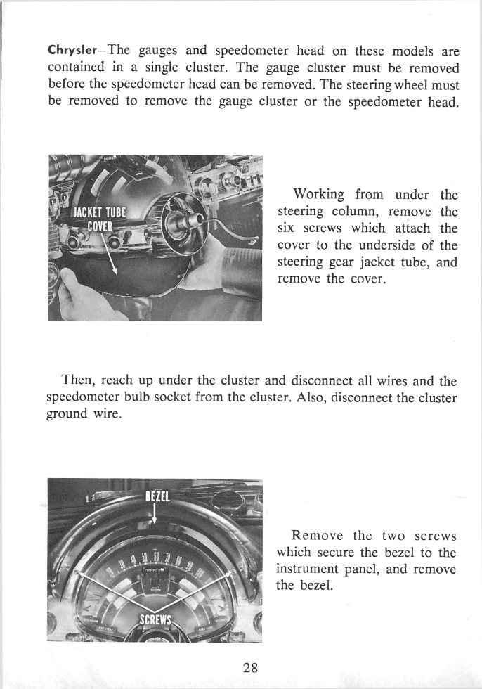 Front cover page 2 - There's a new look up front page 3 - Table of contents page 4 - General Information on Instrument Panel Service page 5 - Gauge Testing Procedures page 6 - Testing the Temperature Gauge Sending Unit page 7 - Testing the Oil Pressure Sending Unit page 8 - Testing the Oil Pressure Sending Unit continued page 9 - Testing the Fuel Gauge Sending Unit page 10 - Testing the Fuel Gauge Sending Unit continued page 11 - Gauge Voltage Regulators page 12 - External-Type Voltage Regulator page 13 - Internal-Type Voltage Regulator page 14 - Testing Panel Gauges - Plymouth page 15 - Testing Panel Gauges continued- Plymouth page 16 - Testing Panel Gauges continued - Chrysler page 17 - Testing Panel Gauges continued - All Other Models page 18 - Testing Panel Gauges continued - All Other Models page 19 - Cluster Removal - Valiant page 20 - Cluster Removal continued - Valiant page 21 - Cluster Removal - Lancer page 22 - Cluster Removal - Plymouth page 23 - Cluster Removal - Dart, Polara and DeSoto page 24 - Cluster Removal continued - Dart, Polara and DeSoto page 25 - Cluster Removal continued - Dart, Polara and DeSoto page 26 - Cluster Removal continued - Dart, Polara and DeSoto page 27 - Cluster Removal continued - Dart, Polara and DeSoto page 28 - Cluster Removal - Chrysler page 29 - Cluster Removal continued - Chrysler page 30 - Cluster Removal continued - Chrysler page 31 - Conclusion back cover