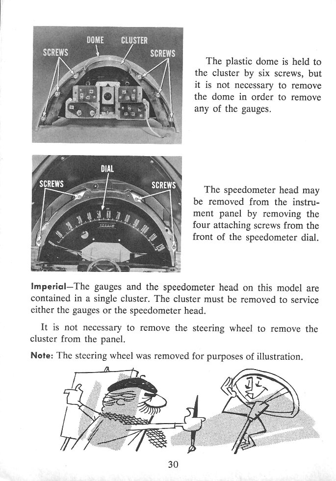 Front cover page 2 - There's a new look up front page 3 - Table of contents page 4 - General Information on Instrument Panel Service page 5 - Gauge Testing Procedures page 6 - Testing the Temperature Gauge Sending Unit page 7 - Testing the Oil Pressure Sending Unit page 8 - Testing the Oil Pressure Sending Unit continued page 9 - Testing the Fuel Gauge Sending Unit page 10 - Testing the Fuel Gauge Sending Unit continued page 11 - Gauge Voltage Regulators page 12 - External-Type Voltage Regulator page 13 - Internal-Type Voltage Regulator page 14 - Testing Panel Gauges - Plymouth page 15 - Testing Panel Gauges continued- Plymouth page 16 - Testing Panel Gauges continued - Chrysler page 17 - Testing Panel Gauges continued - All Other Models page 18 - Testing Panel Gauges continued - All Other Models page 19 - Cluster Removal - Valiant page 20 - Cluster Removal continued - Valiant page 21 - Cluster Removal - Lancer page 22 - Cluster Removal - Plymouth page 23 - Cluster Removal - Dart, Polara and DeSoto page 24 - Cluster Removal continued - Dart, Polara and DeSoto page 25 - Cluster Removal continued - Dart, Polara and DeSoto page 26 - Cluster Removal continued - Dart, Polara and DeSoto page 27 - Cluster Removal continued - Dart, Polara and DeSoto page 28 - Cluster Removal - Chrysler page 29 - Cluster Removal continued - Chrysler page 30 - Cluster Removal continued - Chrysler page 31 - Conclusion back cover
