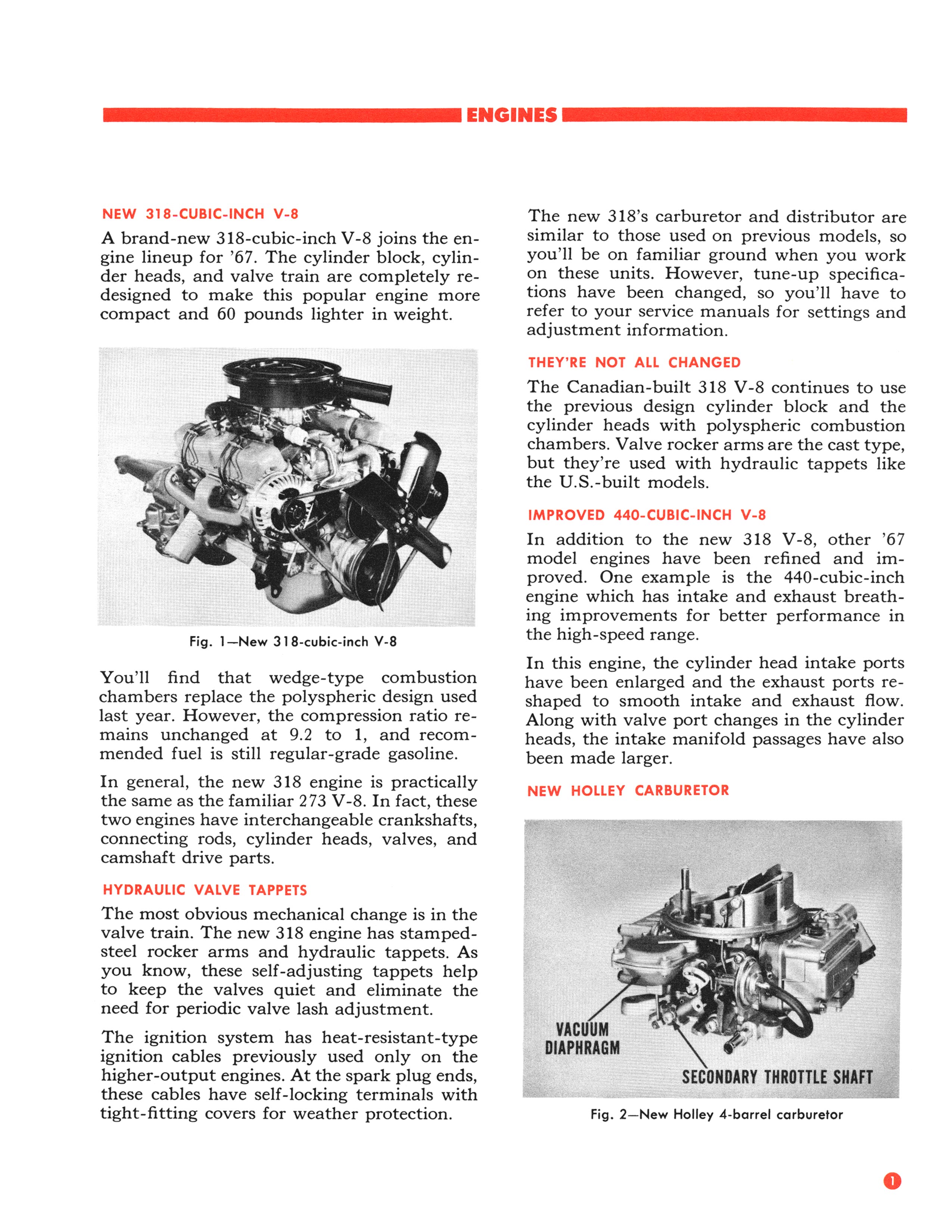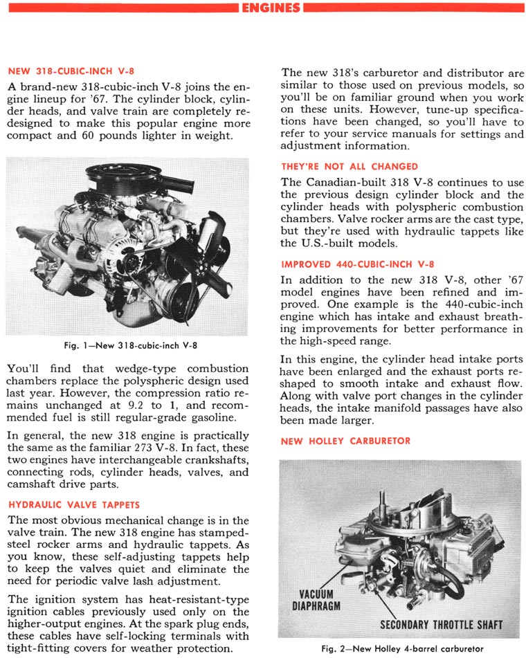 Front Cover Introduction Page & Table of Contents Page 1 - New 318 Engine, Hydraulic Valve Tappets & New Holley Carburetor Page 2 - Vacuum Works The Throttle & Holley 4-Barrel Adjustments Page 3 - More Holley 4-Barrel Adjustments Page 4 - The 400 Engine & General TorqueFlite Improvements Page 5 - A-904 Improvements & 727 Changes Page 6 - Hi-Po 440 Rear Axles & IMPERIAL Drive-Line Changes Page 7 - IMPERIAL Suspension Design Page 8 - New Brake System Improvements Page 9 - The Hydraulic Junction & The Warning Light Switch Page 10 - Dual Diaphragm Power Brake Units & Brake Shoe Improvements Page 11 - Steering System Changes Page 12 - More On Steering System Changes Page 13 - Silent Door Latches, Flow-Through Ventilation & Convertible Tops Back Cover