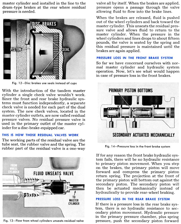 Front Cover Introduction Page & Table of Contents Page 1 - Tandem Master Cylinder Hydraulics Page 2 - Return Springs & Ports, How The Master Cylinder Works Page 3 - System Pressures & The Compensating Ports Page 4 - Filler Ports Permit Pump-Up & Use Of Residual Pressure Page 5 - Pressure Loss In The Front & Rear Brake System Page 6 - The Brake Warning Light System Page 7 - The Brake Line Tee Is A Junction & A Switch Page 8 - Service Highlights & Sidelights Page 9 - Using A Push Rod Retainer, If The Piston Sticks & Servicing The Residual Valve Page 10 - Piston Retainers Are Different & Cleaning And Inspecting Page 11 - Bench Cleaning & Brake System Bleeding Page 12 - Getting Rid Of The Air & About The Compensating Ports Page 13 - Checking The Primary Compensating Port & Ending Word Of Caution Back Cover