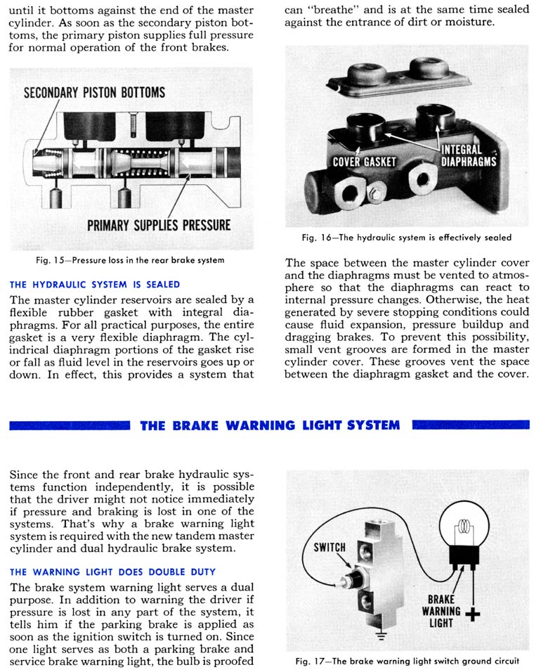 Front Cover Introduction Page & Table of Contents Page 1 - Tandem Master Cylinder Hydraulics Page 2 - Return Springs & Ports, How The Master Cylinder Works Page 3 - System Pressures & The Compensating Ports Page 4 - Filler Ports Permit Pump-Up & Use Of Residual Pressure Page 5 - Pressure Loss In The Front & Rear Brake System Page 6 - The Brake Warning Light System Page 7 - The Brake Line Tee Is A Junction & A Switch Page 8 - Service Highlights & Sidelights Page 9 - Using A Push Rod Retainer, If The Piston Sticks & Servicing The Residual Valve Page 10 - Piston Retainers Are Different & Cleaning And Inspecting Page 11 - Bench Cleaning & Brake System Bleeding Page 12 - Getting Rid Of The Air & About The Compensating Ports Page 13 - Checking The Primary Compensating Port & Ending Word Of Caution Back Cover
