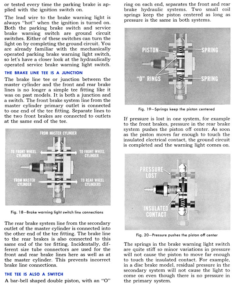 Front Cover Introduction Page & Table of Contents Page 1 - Tandem Master Cylinder Hydraulics Page 2 - Return Springs & Ports, How The Master Cylinder Works Page 3 - System Pressures & The Compensating Ports Page 4 - Filler Ports Permit Pump-Up & Use Of Residual Pressure Page 5 - Pressure Loss In The Front & Rear Brake System Page 6 - The Brake Warning Light System Page 7 - The Brake Line Tee Is A Junction & A Switch Page 8 - Service Highlights & Sidelights Page 9 - Using A Push Rod Retainer, If The Piston Sticks & Servicing The Residual Valve Page 10 - Piston Retainers Are Different & Cleaning And Inspecting Page 11 - Bench Cleaning & Brake System Bleeding Page 12 - Getting Rid Of The Air & About The Compensating Ports Page 13 - Checking The Primary Compensating Port & Ending Word Of Caution Back Cover